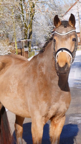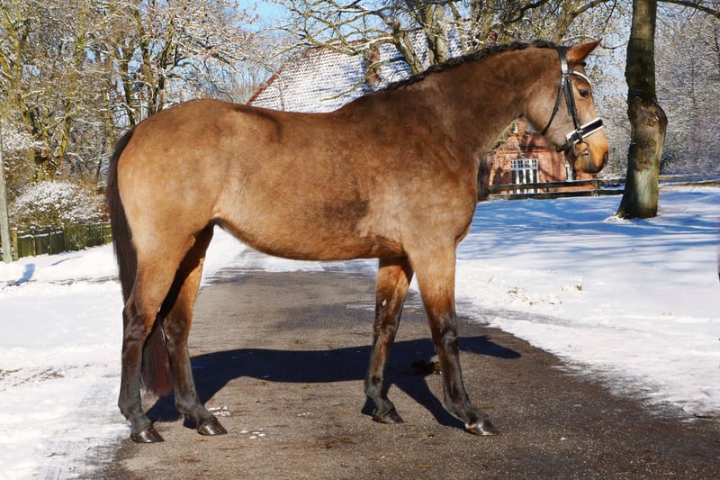 Zum Verkauf steht eine wunderschöne Pony-Stute im XXL-Format mit einem Stockmaß von 152 cm. Sie besticht durch ihre traumhafte Buckskin-Farbe und ihr liebenswertes, freundliches Wesen. Aktuell steckt sie noch im Winterfell - darunter verbirgt sich eine echte Schönheit mit Ausstrahlung und Charme. Sie kennt die Grundlagen im Umgang, Ist brav und unkompliziert im täglichen Handling Geht zuverlässig in der Halle sowie auf dem Außenplatz motiviert und bereit, weiter gefördert zu werden Ein vielversprechendes Talent zum sportlichen Reitpony. Mit weiterer Ausbildung entwickelt sie sich sicher zu einem tollen Partner für ambitionierte Reiter. Frisch getüvt (tierärztlich untersucht) Ein Pony mit Herz, Format und Perspektive - ideal für Reiter, die ein charmantes Nachwuchspony mit Potenzial suchen. Abstammung: Rivers Dancing AS x Santano x Sandro Hit x Jazz Weitere Informationen gerne auf Anfrage.