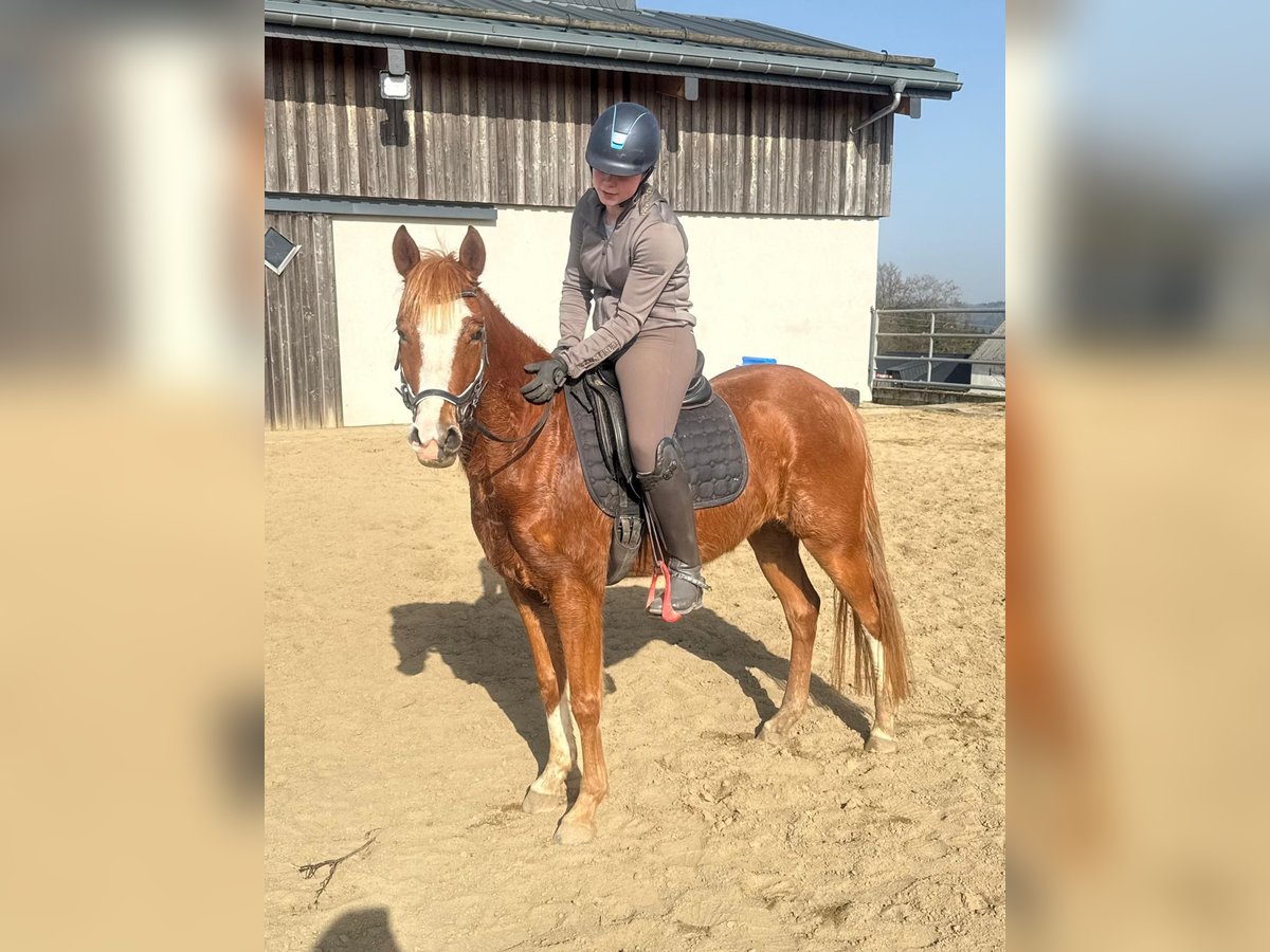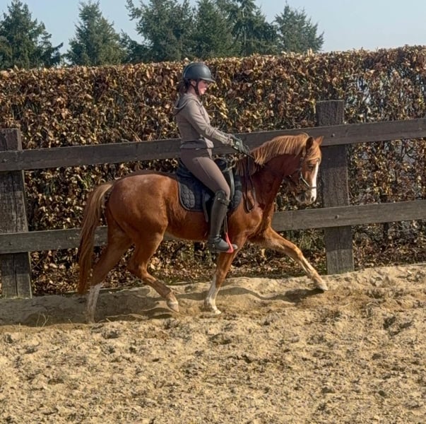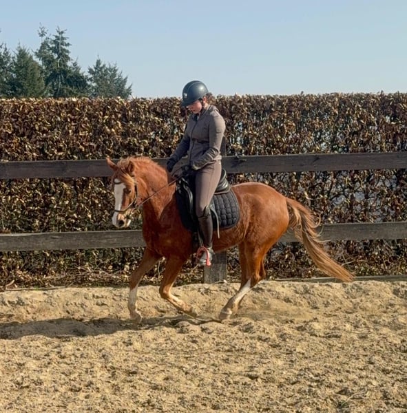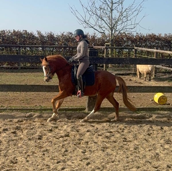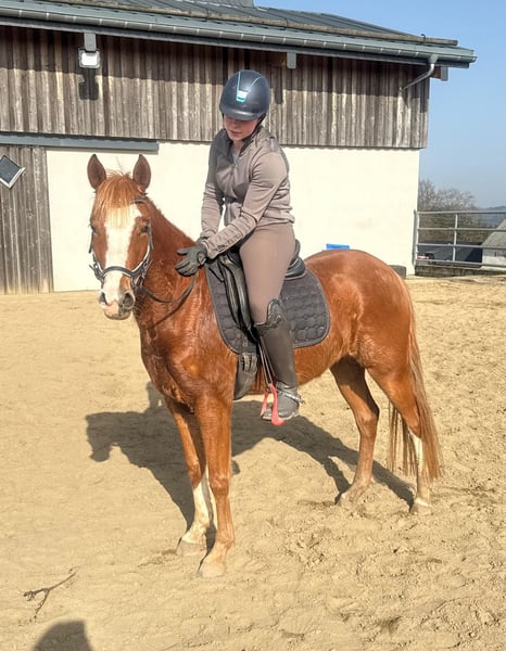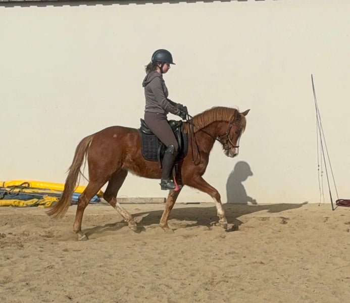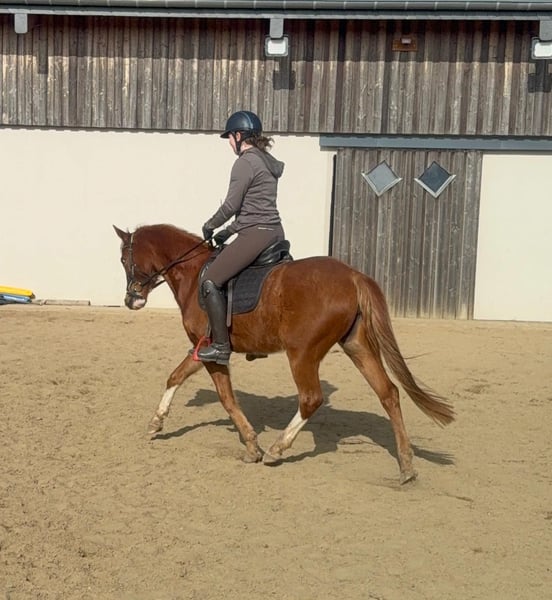 Zum Verkauf steht eine etwa 143 cm große, fast 5 Jahre alte Deutsche Reitpony Stute. Sie ist als Staatsprämienstute ausgezeichnet und zeigt gute Bewegung. Sie ist in der Dressur bis A** ausgebildet und auch schon auf Turnieren vorgestellt worden. Im Training wurde jetzt mit L angefangen. Sie springt auch gut und wurde im Training mehrfach in Parcours mit 60cm gesprungen. Dies ist natürlich noch ausbaufähig. Sie zeigt keine Unarten und ist insgesamt sehr brav mit Reiter. Man sollte trotzdem etwas reiten können. Sie lebt bei uns Im Offenstall und ist sehr verträglich. Die Box kennt sie auch. Wer ein tolles vielseitiges Pony für Sport, Freizeit oder Zucht sucht, ist bei ihr genau richtig. Krankheiten oder Allergien sind nicht bekannt. Eine AKU darf gerne gemacht werden. Für das Probereiten, Vorreiten oder anderes Ausprobieren des Pferdes berechnen wir 35€. Beim Kauf wird dies gutgeschrieben. Gerne anrufen oder eine Nachricht senden 0157 36803742 Alle Angaben ohne Gewähr, Preisänderungen vorbehalten, Transport möglich, Onlinekauf möglich