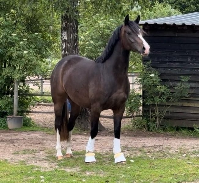 "Trust me Darling" impresses with her willingness to perform and calm, balanced temperament — three good basic gaits and her distinctive coloring make her a real eye-catcher. She proved this right away at her first competition: Vice-Championess of the 4-year-old mares and geldings in Hamburg/Schleswig-Holstein 2025. There, she also demonstrated composure and was consistently exemplary. Her breeding is equally interesting, as she is a Verband Premium mare from an exceptional performance family: both her dam and sire were highly successful in sport up to FEI level/S** and both participated in the DJM! She is now ready to develop as a young FEI sport pony. We are looking for a caring, supportive home for this wonderful pony.