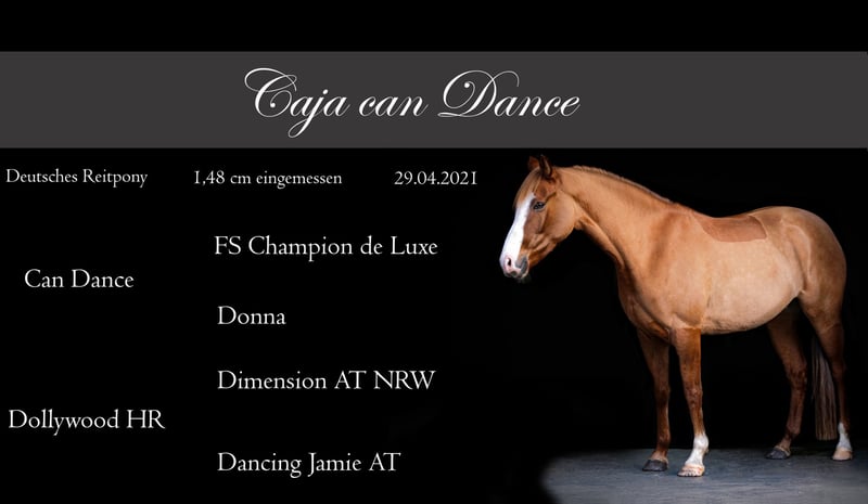 • Deutsches Reitpony • *April 2021 • Fuchsfalbe • El. H. Can Dance x Dimension AT NRW x Dressman I • 1,48m eingemessen • A** - Dressur platziert • Springpferde A hochplatziert, 2. Platz mit 8,0 • E-Springen gewonnen • Gelände-WBO gegangen Zum Verkauf steht eine wunderschöne deutsche Reitpony-Stute, geboren im Jahr 2021. Sie ist eine elegante Falbe mit einem Stockmaß von 148 cm und bringt somit die ideale Größe für ambitionierte Reiterinnen und Reiter mit. Diese talentierte Stute ist besonders im Dressursport zu Hause und überzeugt durch ihre Lernfreudigkeit, ihre angenehme Art und ihr braves Wesen. Sie ist gut ausgebildet, freundlich im Umgang und eignet sich sowohl für den Freizeitbereich als auch für den Turnierreitsport. Sie hat Turniererfahrungen, die Sie in Dressur bis A**, als auch beim Springen bis zur Springpferde A* (8,0)mit Platzierung nachweißen kann. Auch in der Vielseitigkeit hat Sie erste Erfahrungen gesammelt, die sie bisher gut gemeistert hat. Gelände alleine stellt auch kein Problem da! Sie wurde am 09.11.2025 mit 1,48cm eingemessen! Gerne ist ein Probereiten möglich! Röntgenbilder von Januar 2026 sind inklusive Rücken und Hals vorhanden und können auf Wunsch gerne versendet werden! Bei Interesse freuen wir uns auf Ihre Kontaktaufnahme!