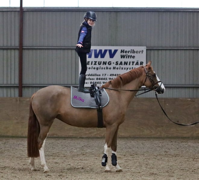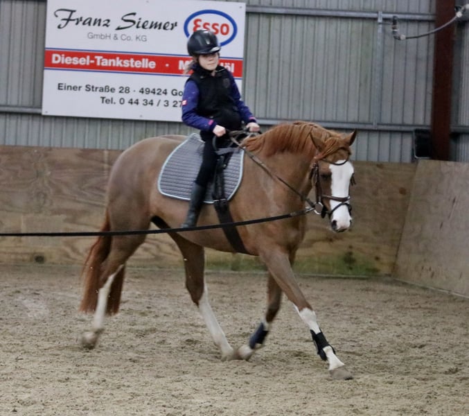 Verkaufe Deutsches Reitpony-Stute (Welsh B x Hannoveraner = Reitpony) Zum Verkauf steht eine wunderschöne deutsche Reitpony-Stute mit Top Abstammung für den Sportbereich, geboren im Jahr 2021. Sie besticht durch ihr elegantes Erscheinungsbild in Fuchsfärbung und hat ein Stockmaß von 156 cm. Die junge Dame ist bestens für den Dressursport geeignet und zeigt viel Talent sowie eine angenehme Grundhaltung. Charakterstark und freundlich. . Milka ist eine Stute mit Charm und freundliche Einstellung, sie eine Familie sucht wo sie ihre geduldige Art zur Geltung bringen darf. Lernwillig und arbeitsbereit, Milka hat keine Ambition zu flitzen, ist eher gemutlich unterwegs. Röntgenologisch untersucht jedoch ohne Befund, klinische Ankaufsuntersuchung wird zeitnah zur Übergabe neu durchgeführt. Milka ist zurzeit geschoren und unter Winterdecke. Sie ist freundlich, lernwillig und lässt sich gut reiten. Ideal Familienpony/Pferd genau richtig für eine Mutter und Kind / Kinder zu reiten. Milka ist von Kindern ab 8 Jahre geritten, die ist eine zuverlässige, genügsame Partnerin für den Dressurunterricht, Turniere oder allg Freizeitpartnerin die viel Freude schenken kann. Bei Interesse oder weiteren Fragen stehen wir gerne zur Verfügung. Nur seriöse Anfragen, Besichtigungen Samstagvormittag nach telefonischer Vereinbarung möglich. Videos sind vorhanden. Wir bitten um Verständnis, dass Videos werden nur nach telefinischer Kontaktaufnahme per whatsapp verschickt.