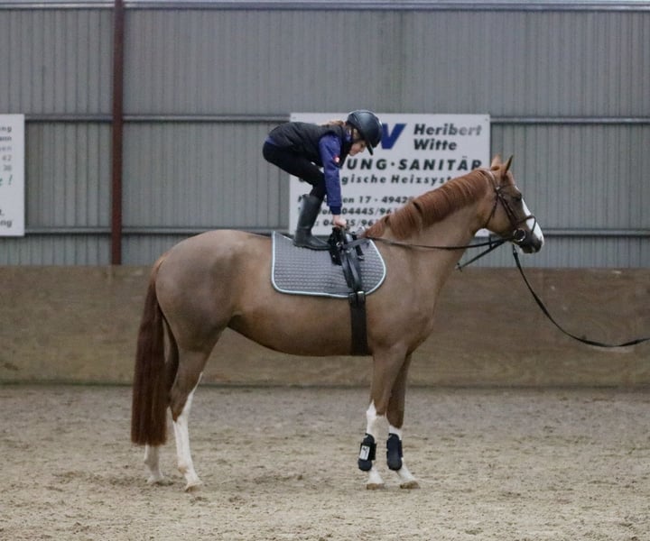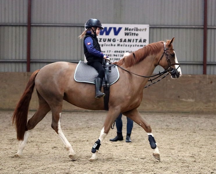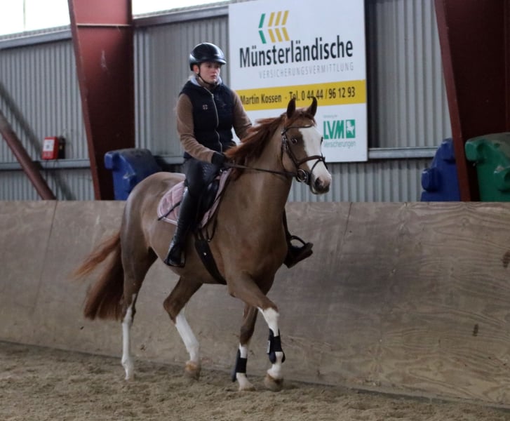 For sale is a beautiful German riding pony mare (Welsh B x Hanoverian) with excellent pedigree, born in 2021. She impresses with her elegant appearance in a chestnut color and has a height of approximately 15.6 hands. This young lady is ideally suited for dressage and demonstrates great talent along with a pleasant, relaxed demeanor. She is confident, friendly, and has a strong character. Milka is a mare with charm and a friendly disposition. She is seeking a family where she can showcase her patient nature. Eager to learn and willing to work, Milka is not inclined to spook or bolt; she prefers a calm, relaxed ride. Her X-rays have been examined with no findings, and a clinical pre-purchase examination will be conducted shortly before handover. Currently, Milka is clipped and wearing a winter blanket. She is friendly, eager to learn, and easy to ride. An ideal family pony, perfect for a mother and child or children to ride. Milka has been ridden by children aged 8 and older. She is a reliable, modest partner for dressage lessons, competitions, or leisure riding, providing much joy and companionship. If interested or for further questions, please feel free to contact us. Serious inquiries only. Viewings are possible on Saturday mornings by appointment via phone. Videos are available and will be sent via WhatsApp only after initial phone contact.