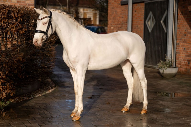 We offer a beautiful riding pony for sale. This elegant Cremello lady was born in 2019 and has already developed into a real eye-catcher. With a height of 147 cm (measured), she is the perfect choice for ambitious riders looking for a reliable partner in dressage sport. Her first-class pedigree and solid training have already allowed her to shine several times in dressage sport. **Features:** - Breed:** German Riding Pony - Sex:** Mare - Year of birth:** 2019 - **Color:** Cremello - Height:** 147 cm - **Discipline:** Dressage This mare not only impresses with her extraordinary color, but also with her friendly nature and willingness to learn. She shows great potential in dressage and is ready to grow with her new owner and become a great FAI pony. If you are looking for a talented and charming pony who will be a pleasure to ride in the arena as well as to handle on a daily basis, then this mare could be just the right choice for you. For more information or to arrange a viewing, please contact us. We look forward to hearing from you!