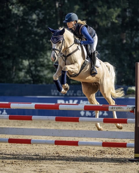 Excellent German riding pony mare in a special color, available directly from the breeder! Due to the cessation of her breeding career, our striking pony mare Catinka is for sale. What sets Catinka apart is her outstanding manners and her talent over fences. She has achieved numerous placings and wins in show jumping competitions at levels A* and A**, with many scores above 8. She is very cautious and prefers to avoid mistakes. She naturally masters flying changes flawlessly. At age 5, she qualified for the Bundeschampionat of riding ponies. This pony mare impresses in daily work especially through her rideability and work ethic. She has a pleasant go and always listens attentively, making her very manageable. Thanks to her willingness to learn and her rideability, Catinka has also been repeatedly highly placed in L-level dressage competitions. Catinka is very sweet and well-behaved, familiar with dogs, tractors, and children. She is shoe and loading safe. She can be ridden alone comfortably, even on open fields, and she also rides great without a saddle. She is very suitable for children to ride, but we do not sell her as a beginner pony. Her dam (last picture) also comes from our own breeding and was placed in Spring Pony L at age 5. Her sire has been successful in jumping at A-level and later competed successfully in FEI dressage. Inquiries only by phone or WhatsApp at: 0159 02479930