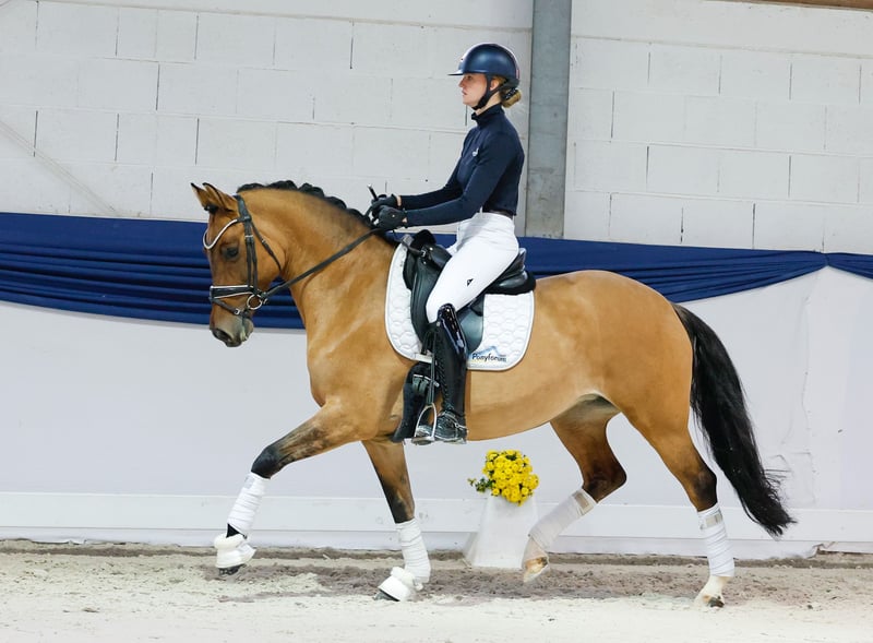 In unserer Kollektion stehen streng selektierte Reitponys f�r alle Anspr�che: Ausbildungs-, Zucht- und Kinderponys Hier gelangen Sie zur Gesamtkollektion: https://ponyforum.auction platziert in Dressurprüfungen Klasse L, Dressurpferdeprüfungen Klasse A und Reitpferdeprüfungen, 3j. qualifiziert zum Bundeschampionat, Stutenleistungsprüfung Ergebnis 8,35, Staatsprämienstute Mit der siebenjährigen Carlita steht eine hervorragend ausgebildete und weit platzierte Stute in unserer Kollektion. Die hübsche Braunfalbstute kann schon eine beachtliche Erfolgsgeschichte vorweisen: sie war dreijährig zum Bundeschampionat nominiert, im Alter von vier Jahren wurde sie mit der Staatsprämie ausgezeichnet und legte ihre Stutenleistungsprüfung mit der Traumnote 8,35 ab. Im Anschluss startete sie ihre Karriere im Dressurviereck und war von Reitpferde- über Dressurpferdeprüfungen bis aktuell zu Dressurprüfungen der Klasse L erfolgreich. Special effects? Gebrauchsanweisung? Gibt es alles nicht. Carlita ist sowohl beim Reiten wie auch im handling absolut unkompliziert und kooperativ, reiterlich top ausgebildet und absolut easy nachzureiten. Sie ist sowohl ein Verlass- wie auch Sportpony, das auch gerne eine Geländerunde dreht und auch einen Parcours springt.