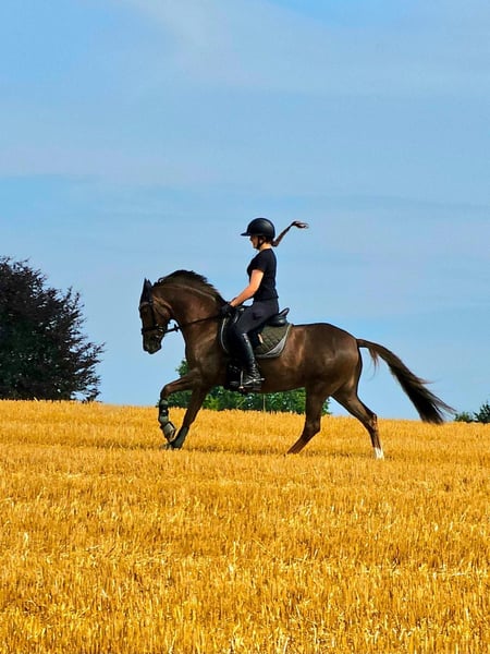 Malheureusement, les poneys ne grandissent pas, cette jument poney sportive et attachante est donc à vendre. Elle a été présentée avec succès par sa propriétaire l'année dernière, passant des compétitions de dressage pour poneys jusqu'à la A-Dressage. Elles ont ramené à la maison une rosette 95 % du temps et peuvent se vanter de plusieurs victoires ensemble. À la maison, elle a été formée jusqu'à L**. Elle maîtrise les traversées, les changements de galop simples, les demi-tours… « Rosi » a participé à l'épreuve des poneys de saut d'obstacles au Bundeschampionat à l'âge de 5 ans. Le saut a été un peu négligé cette année, car nous sommes plutôt un écurie axée sur le dressage. Elle sort en extérieur, est au pré ou au paddock tous les jours chez nous. Bien sûr, elle est régulièrement vermifugée, vaccinée et attend maintenant son nouveau partenaire sportif.