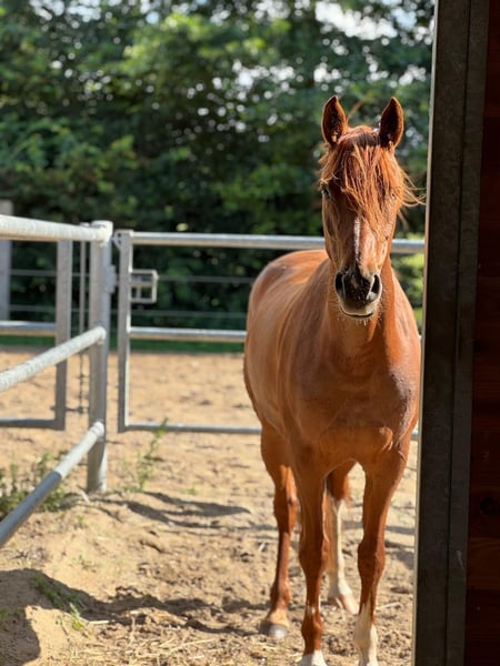 Con pesar, tenemos que dejar ir a nuestra Virginia (Gini), ya que mi hija ha superado la etapa de poni y ahora busca un caballo grande. Nuestra Virginia es una yegua de poni muy especial, que hace latir el corazón de todos. Acompañó con éxito a mi hija desde las clases de iniciación hasta obtener excelentes resultados en concursos A** en salto y en doma. En ambas disciplinas, ha obtenido notas de 8. En doma, Gini está lista para la categoría L y ya muestra movimientos como traversales, galop externo y cambios de pie volados. Bajo la silla, es muy suave y fácil de montar; especialmente en la posición de sentado, se siente muy cómoda, y desde joven ya ha obtenido buenos resultados en competición. En 2021 fue distinguida como yegua de rendimiento estatal. Pero Gini no solo es una joya en competición. Es una verdadera versátil y está dispuesta a participar en cualquier actividad: paseos en campo, montar sin silla, nadar o incluso una excursión a la playa. Ella realiza todo con calma y confiabilidad. Virginia es una pony de 8 años, de tamaño adecuado para cubrir bien al jinete y que también resulta cómoda para jinetes más altos. Durante los cinco años con nosotros, siempre ha estado sana y no ha tenido ningún problema médico. Deseamos para Gini un hogar lleno de amor, donde siga siendo cuidada, valorada y estimulada.