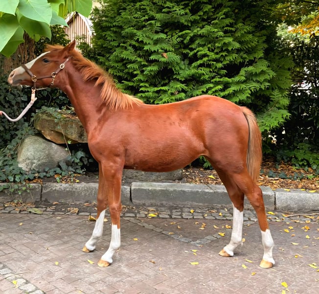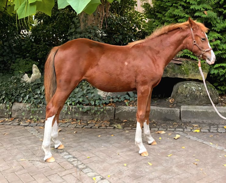 We offer you a top foal, German Riding Pony, from our own breeding for sale: Piroschka, a beautiful mare, born in March 2025. Piroschka is not only a visual highlight with a stunning head featuring a continuous blaze, but she also impresses in motion with clear, excellent gaits. Her exterior is complemented by four white legs and a small white spot under her belly. She has already proven her quality: At the foal registration of her breeding association in Sulingen, she was awarded. Her pedigree includes numerous renowned ancestors. The sire, Primera Vez, is a top-class pony stallion. He competed twice (at five and six years old) in the finals of the Bundeschampionat, where he placed 6th once and 11th once. His reliability as a sire is demonstrated by five already licensed sons. The maternal side perfectly complements the athletic lineage, featuring the proven Westphalian bloodlines of Da Capo, Nantano, and Durello. Piroschka is thus an ideal pony for all areas of equestrian sports. In addition to her top athletic pedigree, Piroschka has a very friendly character. She is trusting, eager to learn, and people-oriented. Piroschka is already familiar with the farrier and loading onto the trailer. Furthermore, she enjoys being groomed, tied up, and having her hooves picked out. She was weaned a month ago and is well-socialized. Her upbringing is species-appropriate in a mixed herd in the pasture, where she is daily with goats, Shetland ponies, and a large horse. At night, she safely spends her time in the stable. Additionally, she is accustomed to tractors, children, and dogs, and always remains calm, composed, and confident in their presence.