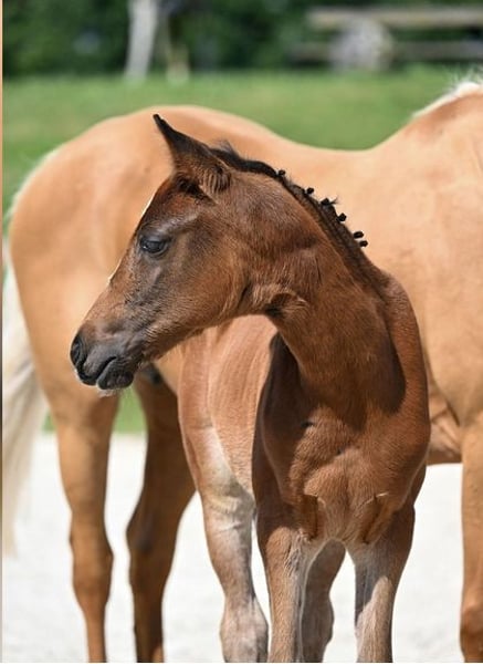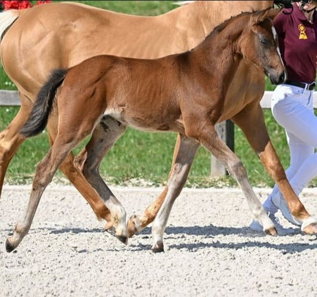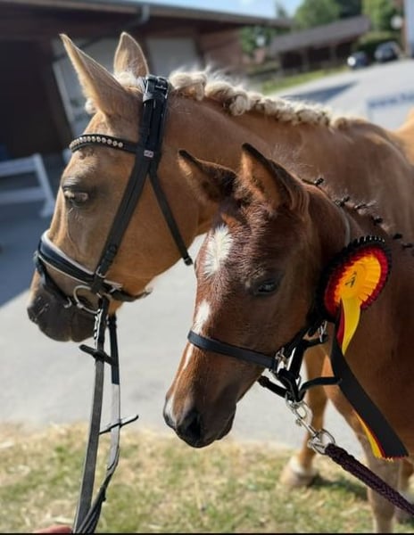 For sale is a promising filly from an excellent sport lineage. Registered and awarded at the BZVKS (among others, 8.5 for type), qualified for the German Foal Championship in Lienen. The sire is Cosmopolitan D NRW, an outstanding stallion with exceptional breeding performance, Bundeschampion, Westphalian champion, and internationally successful in FEI competitions. The dam, Hesselteichs Golden Colour, is a Verband premium mare and has already produced several sport-successful offspring, including a licensed stallion by Venustas Cool Edition (Cosmopolitan NRW x Dancing Fox). The damsire A Gorgeous was himself highly successful from riding horse tests to L-level dressage and has produced several licensed sons (including A New Star I + II). MVM StPrSt Gina by Going East was the reserve champion mare of her elite show and a finalist at the federal mare show, having several licensed sons, including Gandalf (Gestüt Hesselteich), and state premium mares, including the mother of VerbPrSt Golden Maybe, mother of Diamond Touch, Desert Rose, Golden Daydream FH, and Golden West. The foal has a dreamlike exterior – beautiful and correctly built, with a super character – well-behaved, people-oriented, and uncomplicated, and is already familiar with everything in daily handling. A young pony with the best potential for sport and breeding. (will reach final height) Mother and father are Gait Gen free.