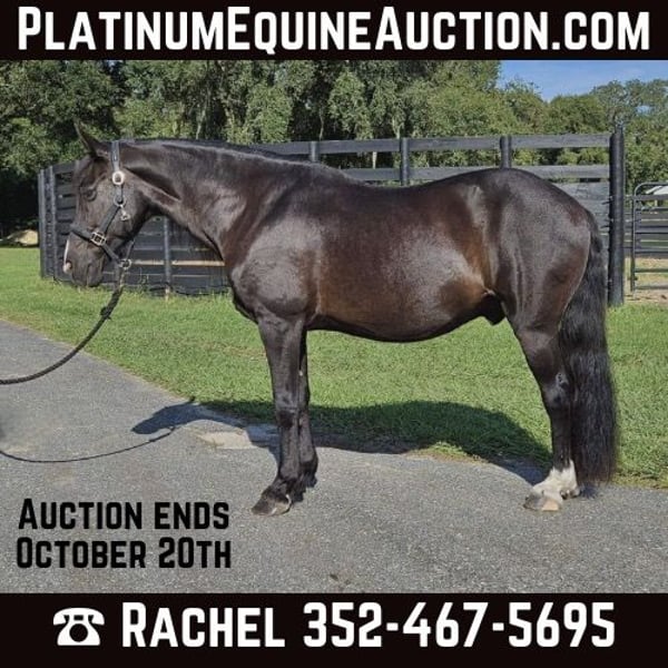 ONLINE AUCTION Place your bids at www.PlatinumEquineAuction.com Starting Bid $3500 Auction ends October 20th, 2024 Need a new saddle? Check out White Rock Saddles on our website or Facebook! 50% of Cupid’s sale price will be donated to Tomorrow’s Equestrian Center, a local nonprofit therapeutic riding center Introducing Cupid! A stunning 14.3H, 14 year old, black gelding with a long, flowing mane and tail. While he looks like a small Friesian, Cupid DNA tests as Caspian x Garrano x Campolina…three rare breeds! Cupid rides english and loves to jump. He has been ridden by experienced kids and adults schooling ground poles to 2’3″. While he is not for a beginner or timid rider, Cupid would be perfect for a confident, advanced rider that wants a gorgeous smaller horse for jumping. Cupid is a smooth ride with a comfortable easy jump. Sensitive to the aids and rides off of the seat. Cupid is a barefoot easy keeper and is up-to-date on shots, Coggins, deworming, floating, sheath cleaning, and hoof trimming. He is located in Ocala, Florida. We can help arrange shipping anywhere in the US. Please call Show Me Sport Horses Rachel at 352-467-5695 with any questions about Cupid. Located in Ocala, FL. ONLINE AUCTION Place your bids at www.PlatinumEquineAuction.com Starting Bid $3500 Auction ends October 20th, 2024 Need a new saddle? Check out White Rock Saddles on our website or Facebook!