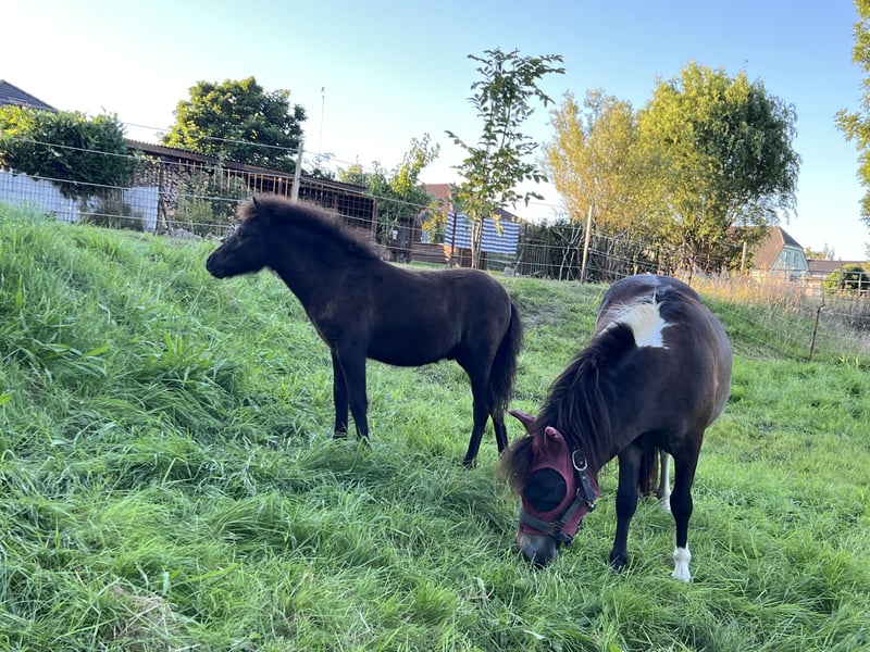 Da wir keine Hengste behalten, steht dieser vielversprechende Youngster zum Verkauf. "Janikos Just in Black" wurde am 02.05.2025 bei uns geboren, auf den ersten Blick mag er, in seiner Rappjacke ein wenig unscheinbar wirken, aber da täuscht man sich gewaltig. Er trägt das Tiger- und Fuchsgen, das heißt er wird möglicherweise noch Austigern. (Gentest liegt vor) Sein voraussichtliches Endmaß wird um die 110cm sein, momentan ist er 88cm groß. Mit dem Endmaß wird er ein hervorragenden Fahr- oder Kinderreitpony macht, ebenfalls wäre es denkbar ihn zur Blutauffrischung in der Zucht zu nutzen. Neben seiner für Classic Ponys eher untypischen Fellfarbe, bringt er sehr gute Grundgangarten mit. Bei Abgabe im November kennt er Anhänger fahren, Spazieren gehen, anbinden, putzen, Hufe geben und vieles mehr. Unsere Ponys bekommen täglich, nach Blutbild angepasstes Mineralfutter. Wird vor Auszug auch noch entwurmt und geimpft. Er bekommt volle Papiere vom Pferdezuchtverband MV, war alle 6-8 Wochen beim Hufschmied und ist sowohl E-Zaun sicher, als auch mit Großpferden und anderen Ponys vertraut. Unsere Ponys kennen die Box, wachsen aber hauptsächlich in Weide-bzw Offenstallhaltung auf. Am 28.06 fand die Fohlenschau statt, wo er seinen Chip und die Bewertung vom Verband erhalten hat, mit 25.5 Punkten qualifizierte er sich zum Elitefohlenchampionat. Beim Elitefohlenchampionat konnte er sich mit 81 Punkten und einer Wertnote von 9.0 die begehrte Elitefohlenprämie sichern. Typ 9 - 9 - 9 Exterieur 9 - 9 - 9 Bewegung 9 - 9 - 9 Seine Geschwister (Mütterlich) aus den Vorjahren konnten sich auf dem Championat mit Endnoten um 9.1 & 8.8 platzieren und fuhren mit der Vizechampionschärpe bei den Dt.Part-bred Shetlandponys nach Hause. Kann gegen Aufpreis, wenn beide Hoden vorhanden, auch bei uns noch kastriert werden. Video vom Elitefohlenchampionat sind auf YouTube zu finden. Janikos Just in Black Classic Pony Rapptiger *02.05.2025 EM ca 110cm M: Viktoria Janica DPbShP Rappschecke 105 cm MV: LH Varus (Shet) MMV: EH Karon I (Shet) V: HB1 Just Dance vom Regenbogen Classic Pony Braunwindfarbpintaloosa 105cm VV: Just in Time (Cl Pony) VMV: Borax vom Silbersee (Shet)