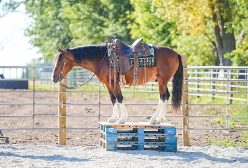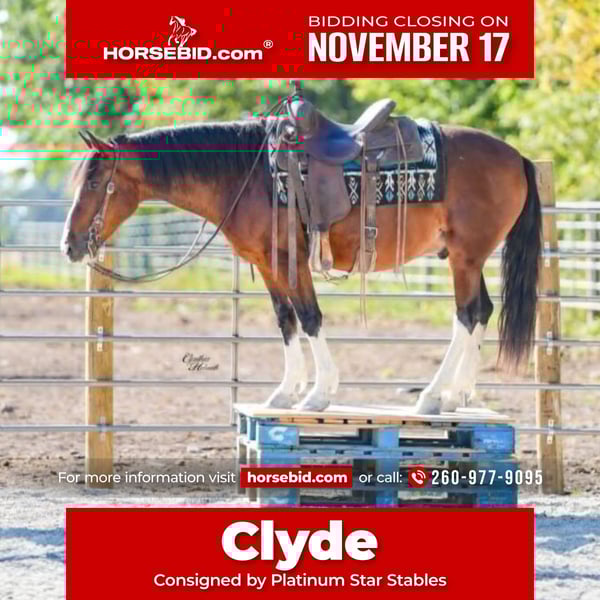 🎲𝓽𝓱𝓮 𝐑𝐈𝐃𝐄𝐑'𝐒 𝓒𝓱𝓸𝓲𝓬𝓮🎲 Happening now thru MONDAY | NOVEMBER 17th - Available EXCLUSIVELY on HorseBid's website! For more details and to register visit: www.Horsebid.com CONSIGNOR CONTACT: Platinum Star Stables 260-977-9095 LOCATION: Independence, Iowa BREED: Quarter Pony REGISTERED: No REGISTERED NAME: Clyde COLOR: Bay HEIGHT: 13.2 AGE: 9 GENDER: Gelding Clyde is a 9 year old bay quarter pony gelding with 4 perfect white stockings and a beautiful blaze. He stands 13.2 hands and is stout enough for the adults and gentle enough for the kiddos. Clyde stands quietly to tack, bridle and mount. He stands well for the farrier and to groom as well. He will walk off nice and gentle. Clyde has sat for months and he rides off the same every time. Clyde not only rides western but does extremely well with English as well. The possibilities are endless with this guy, he can go in any direction whether it be a nice quiet trail ride, a trot down the busy highway or take him through the jumping course. Clyde will never let you down as he always gives his best whenever asked. He absolutely loves to be groomed, bathed and loved on. Clyde sells 100% sounds and comes with a clean set of x-rays available upon request. Don’t miss out on Clyde the pony. For more info call Ervin at 260-977-9095 would be happy to answer any and all questions.
