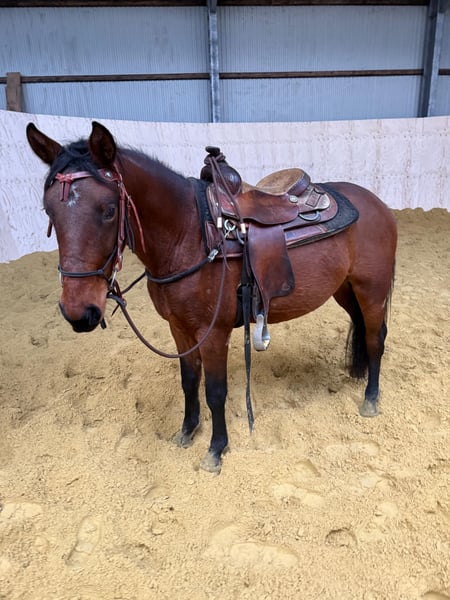 For sale is a gelding born in spring, currently three years old, with no known pedigree. He stands approximately 14.1 hh and has a solid, compact build. He has already been well-grounded and prepared for riding (due to his age, he has not yet been backed). He rides calmly with saddle and bridle, and is comfortable with objects on his back. We have also ridden him several times in double longeing. He is quite laid-back and relaxed, making him a great leisure partner or suitable for someone with ambitions. He is very sociable in a group setting and is familiar with both open stalls and box stalls. In handling, he is very easygoing and cooperates well with everything. No known illnesses or allergies. A health check (AKU) can be arranged if desired. A trial ride costs €35, which will be credited towards the purchase if the horse is bought. Please call or message us at 0157 36803742. All information is provided without guarantee. Subject to price changes. Transport can be arranged. Online purchase possible.