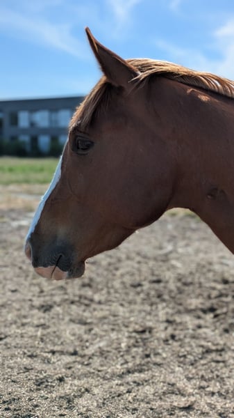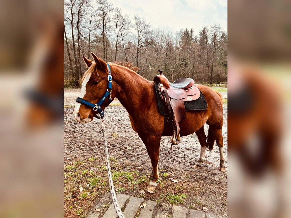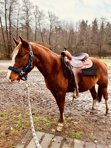 Jonge Quarter-merrie in goede handen te plaatsen. Socke kwam vorig jaar als gezelschapspaard bij ons en liep samen met een Tinkermix op de grote wei. Hij is halster- en longeerbaar, kent de hoefsmid, dierenarts, trailer rijden, poetsen en aan de longeerlijn. Voorwaartse standfouten. Het wordt nu tijd dat hij zijn eigen weg gaat. Hij is wat dominant en zal af en toe vragen of jij nog steeds de baas bent. Vanwege gezondheidsredenen is er nog geen grondwerk met hem gedaan. Geen Quarter-papieren aangevraagd, maar de ouders zijn wel bekend. Het paard heeft alleen een groen paspoort.