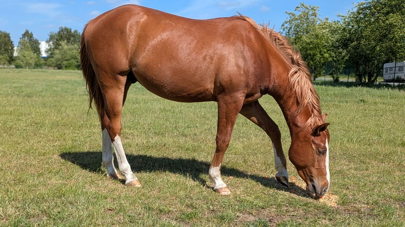 Jeune quarter horse, gelding, à donner à des mains expérimentées. Socke est arrivé l’année dernière comme cheval de compagnie et paissait avec un mélange de Tinker dans le grand pâturage. Il est halter-trainé, connaît le maréchal, le vétérinaire, le transport en van, le pansage et le pansage en longe. Il présente une légère déviation de posture à l’avant. Il est temps pour lui de suivre sa propre voie. Il peut être un peu dominant et demande parfois si vous êtes toujours le chef. Pour des raisons de santé, aucune mise en selle ou travail en liberté n’a encore été effectué avec lui. Aucun certificat Quarter n’a été demandé, mais ses origines sont connues. Le cheval possède uniquement un passeport vert.