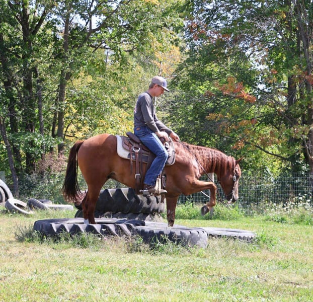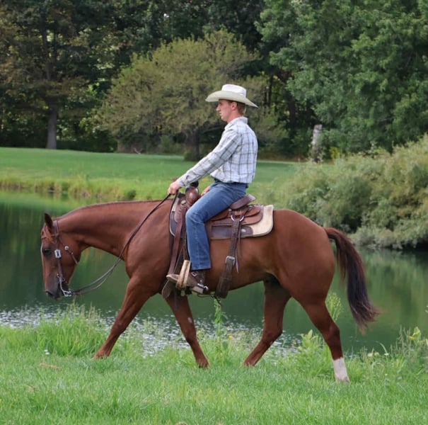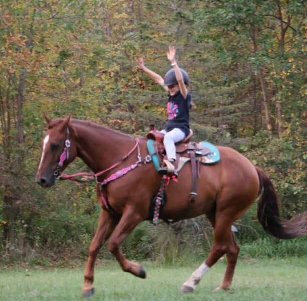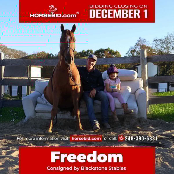 ⚜️ 𝓽𝓱𝓮 𝐇𝐨𝐫𝐬𝐞𝐦𝐚𝐧'𝐬 𝓢𝓱𝓸𝔀𝓬𝓪𝓼𝓮⚜️ Happening now thru MONDAY | DECEMBER 1st - Available EXCLUSIVELY on HorseBid's website! For more details and to register visit: www.Horsebid.com CONSIGNOR CONTACT: Blackstone Stables 248-390-6831 LOCATION: Howell, MI BREED: Quarter Pony REGISTERED: No COLOR: Chestnut HEIGHT: 14.2 AGE: 6 GENDER: Gelding If a horse could wear a halo Freedom would have one! Freedom is a 14.2hh 6 yo quarter pony gelding. He's a stunning bright chesthnut in color with great bone structure and solid conformation. Freedom as his name implies gives you that feeling your a carefree child galloping an open field every time you swing your leg over his back. He has a very cheerful but calm demeanor. Freedom walk, trot and canters with ease and stops on a dime. He comes equipped with effortless transitions both upward and down. He has been a huge asset to our program as he will gladly teach the smallest riders the ropes and will also take care of the most timid adults, while also being fun for a rider who knows a little something. Freedom loves the trails, he has been ridden thru deep woods, big open fields, and has crossed water. He has participated in all of the mounted games, and obstacle courses with the most beginner riders. Any job you ask of Freedom he will do it with patience and ease. Freedom has fantastic ground manners and will stand for anything. He has been thru our extensive desensitization program, and has passed with flying colors. He's been exposed to tarps pool noodles, inflatable costumes, bridges, flags, and busy roads. We cannot find anything to spook him. He also has a great deal of liberty training and will lay down on command. He's a horse who wants a best friend and who loves attention. He plays well outside with all others. This horse will make you want to ride and build you up every time you hop on! He would be a huge addition to a lesson program, a family type of horse or just that all around always dependable mount.
