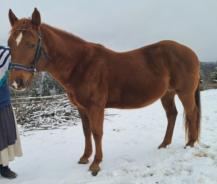 We are looking for a new, understanding home for our calm, compact nearly 6-year-old Quarter Horse stallion. We call him Goldi, and he is a very handsome boy. So far, he has been used for breeding. He doesn't know much yet. Therefore, Goldi has not been ridden so far. However, he is load-friendly and can be taken for walks alone without any issues. Goldi is completely fearless and eager to explore when out and about. He can also wait calmly at home alone. He is now familiar with a saddle pad with a longeing girth and has quickly accepted it, including when you lean over his back. Overall, he seems quick to learn. He is still very playful and needs clear boundaries. Goldi is quite social; he tolerates our gelding nearby and even eats from the same feed bucket as him, despite a mare standing next to them. He only needs a simple fence in between. He is absolutely fence-sure and could even be enclosed with a rope without electric fencing. With us, he lives in an open stable with a large turnout and very spacious pastures. This should also be provided in his new home, at least an open stable with plenty of turnout. Goldi's home is in the beautiful South Black Forest. It is also worth mentioning that Goldi currently has no papers, but his parents are registered with AQHA, and we have contacted the breeder to request his pedigree papers. We look forward to genuine, serious inquiries. Best regards and see you soon.