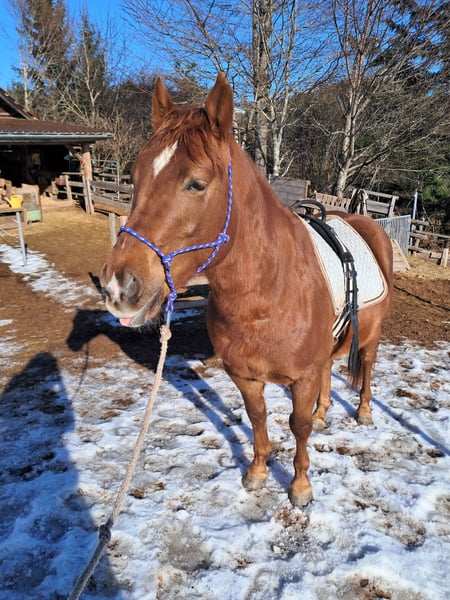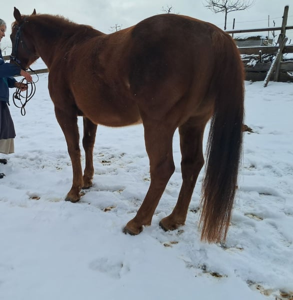 Wir suchen für unseren, nervenstarken ,kompakten bald 6 jährigen Quarter-Horse Hengst ein neues, verstänisvolles Zuhause. Goldi, so nennen wir den Hübschen, war bisher im Deckeinsatz. Er kennt noch nicht sehr viel. Somit ist Goldi noch nicht geritten. Ist jedoch Verladefromm und man kann mit ihm problemlos alleine spazieren gehen. Hierbei ist Goldi total unerschrocken und gerne eifrig unterwegs. Er kann auch mal alleine zuhause warten. Kennt inzwischen das Sattelpad mit Longiergurt und hat das schnell akzeptiert, auch daß man sich über seinen Rücken lehnt. Im allgemeinen scheint er schnell zu lernen. Er ist noch sehr verspielt und braucht klare Grenzen. Goldi ist eigentlich sehr sozial, er toleriert unseren Wallach neben sich und frisst mit ihm auch aus der selben Futterkiste, trotz einer Stut daneben. Er braucht nur einen einfachen Zaun dazwischen. Absolut zaunsicher ,man könnte ihn sogar mit einer Schnur einzäunen ohne Strom. Bei uns lebt er im Offenstall mit großem Auslauf und ganz großen Weiden. Das sollte auch im neuen Zuhause gegeben sein, wenigstens der Offenstall mit großem Auslauf. Zuhause ist Goldi im schönen Südschwarzwald. Was noch zu erwähnen ist, Goldi hat noch keine Papiere, seine Eltern jedoch sind eingetragen bei der AQHA und wir haben beim Züchter um den Antrag für die Abstammungs Papiere für Goldi, angefragt. Nun freuen wir uns auf freundliche, ernstgemeinte Anfragen. Herzliche Grüße und bis bald.
