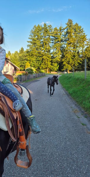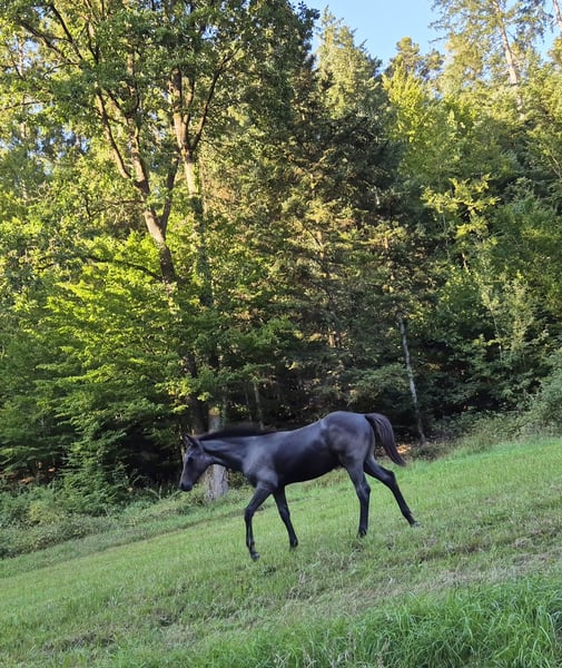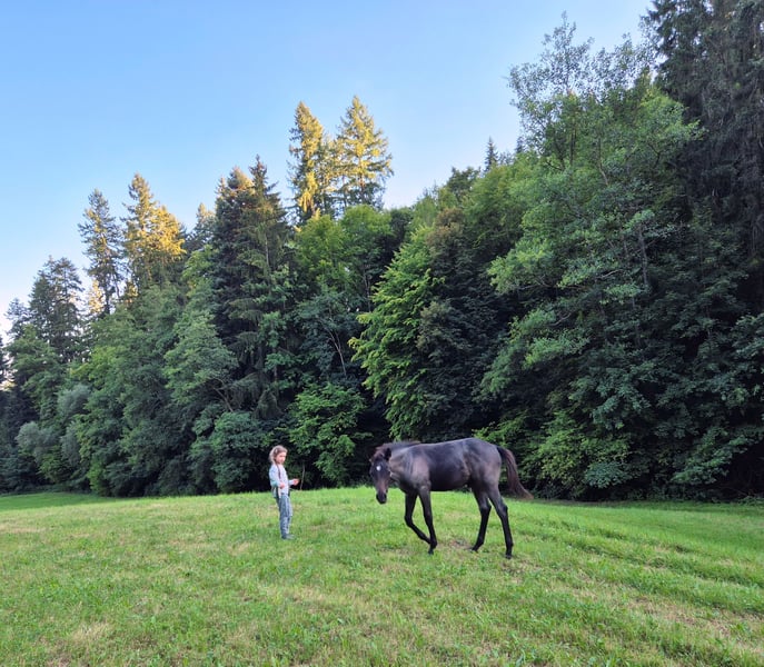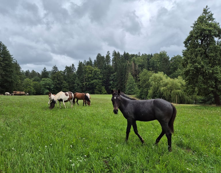 "PEPE Peppy Morena's No. 1", wurde dieses Jahr am 22. April bei uns geboren. Zu diesem außergewöhnlich schönen Hengsfohlen braucht man gar nicht mehr viel schreiben. Man muss nur die Bilder bestaunen... Pepe ist ein extrem gut gebautes QH Hengstfohlen mit der seltenen blue roan (Blauschimmel) Färbung und wahnsinnigen Bewegungen. Er ist nicht nur äußerlich schön, sondern hat einen absolut tadellos feinen Charakter und ist sehr sehr zugewandt. Wie ich es von seiner Mutter kenne & lieben gelernt habe. Pepe ist das 1. Fohlen meiner selbstgezogenen Lieblingsstute "Peppy Morena". Eine Quarter Ponystute, welche 75%-ig feinster QH Abstammung entstammt. Ihr Vater ist der europaweit erfolgreiche "EH One of Lena's Finest" vom Eliesenhof. Die Mutterlinie geht auf Ernst Peter Frey's "Peppy Moreno" zurück. Das andere kaum sichtbare Viertel ist beste Haflingerabstammung und sorgt für Vitalität! Pepe's Vater ist der wunderschöne kompakte "KJ Boogie Mac Hayes". Also ist unser kleiner Pepe eigentlich ein Quarter Horse... Bekommt aber aufgrund des geringen Haflingeranteils, seiner Mutter einen Quarter Pony Equidenpass vom ZSSE e.V. Was auch für den Sport und Zuchtbereich kein Beinbruch ist. Pepe kann ab Dezember 2026 abgesetzt werden. Er ist gechipt, Tetanus geimpft und wird regelmäßig entwurmt. Pferdehänger-Fahren zusammen mit seiner Mutter kennt er schon. Desto artgerechter die zukünftige Haltung ist, desto verhandlungsbereiter sind wir. ***Wir züchten jedes Jahr 2-3 Quarter-Ponys*** Unsere Fohlen dürfen artgerecht im Herdenverbund auf der Weide und im Aktivstall unter besten Voraussetzungen und lückenlosen Überwachung nach Bioland-Bedingungen aufwachsen. Da auch unsere Kleinkinder täglich mit im Stall sind, legen wir Wert auf umgängliche, nervenstarke Pferde. Außerdem lernen unsere Fohlen auch von klein auf andere Tierarten kennen, wie z.B. bei der Mischbeweidung mit unseren Rindern und sind daher schon früh sehr souverän. Durch guten täglichen Umgang lernt unser Nachwuchs nach dem Absetzen in wenigen Tagen das Fohlen-ABC, denn sie folgen uns jetzt schon ohne Halfter in den Hänger und Co. - beste Natural Horsemanship Voraussetzungen! Als nächste Station stellen wir uns eine gute Fohlenweide für Pepe vor und wünschen uns zukünftig ein förderfähiges und artgerechtes Zuhause für ihn. Bei Interesse freu ich mich über einen Anruf oder eine Nachricht, gern auch per Whatsapp 0176 56798081!