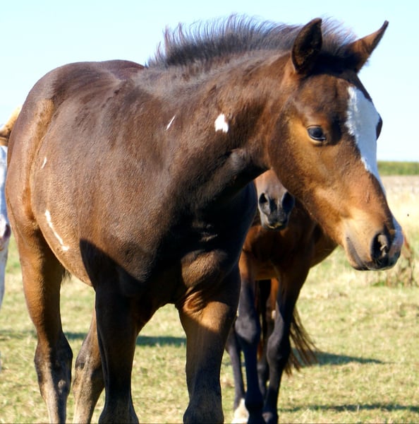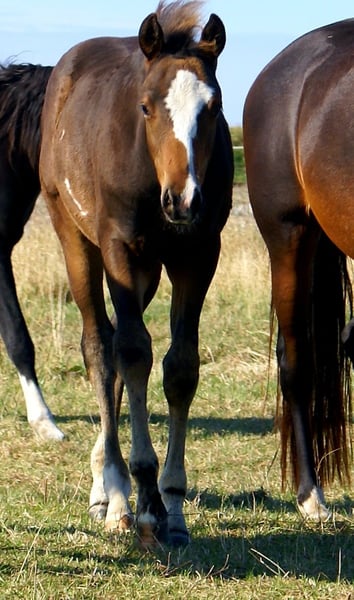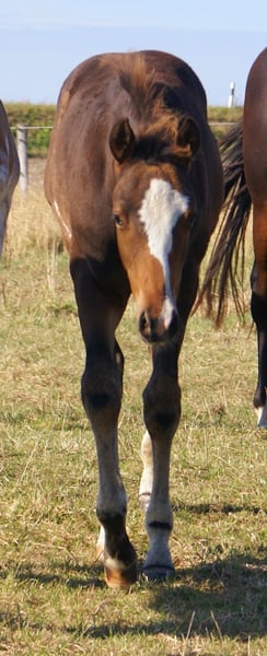 Sympathisches Quarter Pony Hengstfohlen, Dunkelbraun mit spots, Vater: Paint Horse Kingsley n jills wood, Mutter: Deutsches Reitpony von Kennedy WE, das Fohlen hat komplette Papiere, Pass vom ZSSE, wächst mit anderen Fohlen zusammen auf, aufgeschlossener kleiner Herzensbrecher mit markanter Blesse und einem herzförmigen Abzeichen am Hals, leichtfüßige Bewegung, Eltern beide vor Ort
