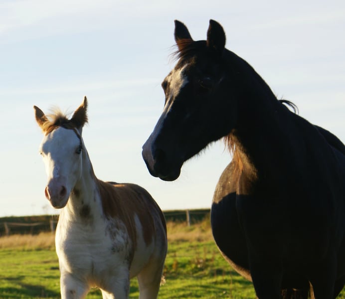 This colt features an eye-catching chestnut overo coat and has two striking blue eyes. His sire is a Paint horse, and his dam is a German Riding Pony. The foal comes with full papers, is well-grown, cheerful, and particularly special.