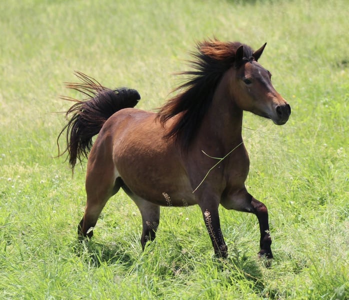 Ein echter Allrounder im Kleinformat! Zum Verkauf steht ein bildhübsches Quarter Pony mit Papieren aus den USA - ‚EINSTEINS BLACK PEARL’ aka Hazel ist gezogen aus der Einsteins Revolution x Smart Chic Olena Linie und einer Shetty-Mix-Stute. Geboren 2021, überzeugt dieses Pony nicht nur durch seine attraktive Abstammung, sondern auch durch sein freundliches, sensibles und sehr intelligentes Wesen. Hazel ist gut geritten, arbeitet aufmerksam mit und zeigt sich immer sehr bemüht, ihrem Reiter zu gefallen. Durch ihre feine Art eignet sie sich hervorragend für Reiter mit Gefühl und Erfahrung, ist aber aufgrund seines jungen Alters (4 Jahre) nicht ausschließlich für Kinder oder Anfänger geeignet. Ob alleine oder in der Gruppe im Gelände, sie ist altersentsprechend brav, nervenstark und unkompliziert. Außerdem ist sie schmiede- und verladefromm und hat ein angenehmes, ausgeglichenes Temperament. Lebt seit Geburt in Offenstallhaltung in großer gemischter Herde. Gesund, robust und mit einem Stockmaß von ca. 1,25 m ist sie die perfekte Partnerin für kleine Reiter, die ein sportliches, talentiertes und charakterstarkes Pony suchen. Ein echtes Herzenspony mit großem Potenzial für die Zukunft! 🥰