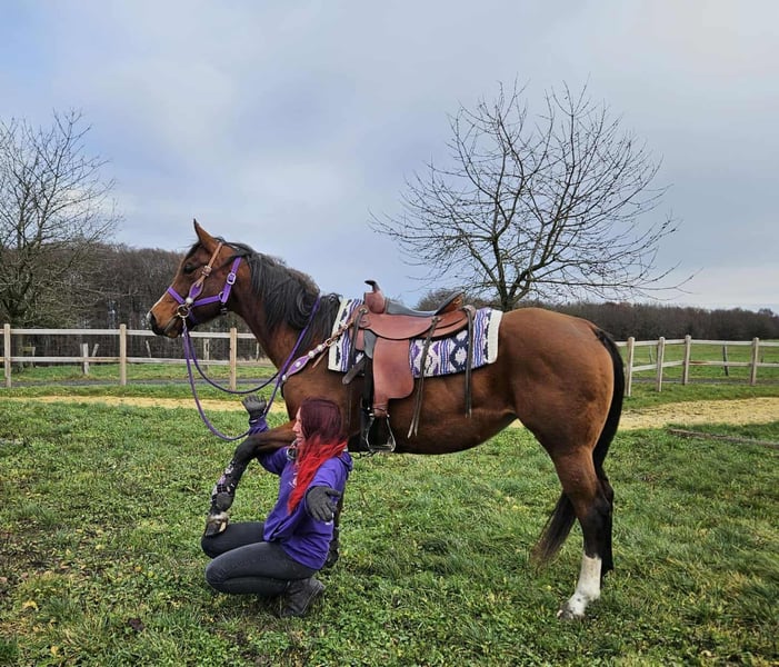Jument Quarter « Simply Revolution » – Partenaire de loisirs avec cœur Âge : 6,5 ans Taille : environ 1,52 m Catégorie de prix : 6 500 € AKU : disponible ✨ Description : Cette jument Quarter de 6 ans séduit par son tempérament amical et sa nature détendue. « Simply Revolution » est parfaitement docile en main, très proche de l’homme et se montre fiable et volontaire sous la selle. Elle connaît aussi bien le travail en manège que les sorties tranquilles – en solo ou en groupe. 🐎 Idéal pour les cavaliers qui : recherchent une jument simple, jeune, fiable en tant que partenaire de loisirs et prête à progresser. Un joli cheval western de loisir, qui procure du plaisir ! 🩺 Nos chevaux sont régulièrement : – vermifugés – soignés par le maréchal-ferrant – contrôlés osteopathiquement 🛍 Boutique : Selle western, briderie & accessoires 🚛 Transport et équipement organisés à prix avantageux selon vos souhaits Notre service : ✅ 3 mois de droit d’échange ✅ Essai : 35 €, chaque cheval supplémentaire 25 € (facturés le jour même en cas d’achat) ✅ 100 € de remise immédiate pour retrait ou transport le jour même ✅ Conseils honnêtes et personnalisés 📞 Pour toute demande, merci de privilégier le téléphone : 0171 – 4001968 🕗 Disponible tous les jours de 8h à 20h ⚠️ Pas de mails ni WhatsApp ⚠️ Toutes les informations sont données à titre indicatif, sans garantie