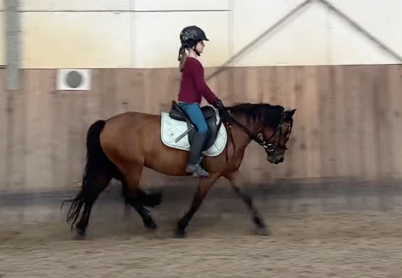 Dartmoor mare with tack. She is well-behaved, does not buck or rear, loads calmly, and stands patiently for the farrier. Comes with a saddle fitted by the saddle fitter and all other necessary equipment, ready to ride. Suitable for lead-rein classes or for obtaining riding badges. Also perfect for leisure riding. She is calm and willing to jump small fences. Videos available. Test rides can be arranged at any time. An equine health certificate at the buyer's expense is also very welcome.