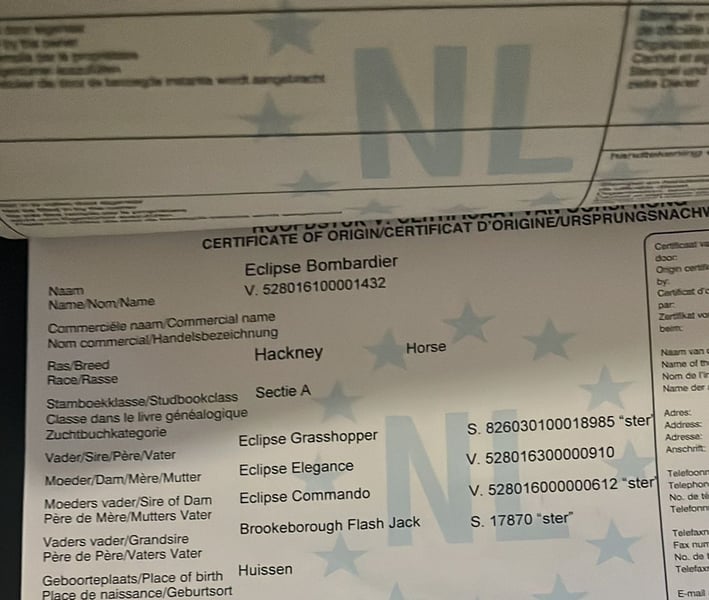 Eclipse... een hackneypony van uitzonderlijke klasse die voor altijd een nieuw thuis zoekt. Een prachtige en wedstrijdervaring ponyhengst met veel elegantie en een zeer mooi gangwerk. Zijn top afstamming verraadt zijn talent. Hij is echt gemaakt voor de sport en voelt zich zowel in dressuur als in springen thuis. Ideaal voor pony-voltige en heeft al meerdere overwinningen behaald in springen tot 80 cm. Eclipse is heel fijn te rijden, reageert op de kleinste hulp en wil graag gefallen. Zijn ambitieuze karakter maakt hem de ideale partner op wedstrijden... hij wil winnen en geeft er alles voor. Daarom is hij uitsluitend geschikt voor ervaren ruiters die met een heel zachte rijstijl een eenheid met hem kunnen vormen. Met zijn aangename hoogte van 1,43 m is hij ook geschikt voor kleine en lichte volwassenen. In principe heeft hij één vaste begeleider, maar hij accepteert ook andere ruiters als zij in staat zijn om fijn en gevoelig met hem om te gaan. Wie dit geweldige sportpony aanspreekt, wordt vriendelijk verzocht contact met mij op te nemen met telefoonnummer, zodat ik zo snel mogelijk contact kan opnemen.