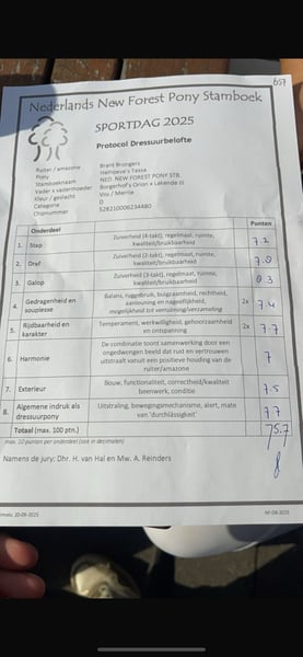 🔍 🏡 ♥️ Heihoeve’s Tessa ♥️ 🏡 🔍 Evt. beschikbaar voor het juiste thuis 🏡 🐴 - Merrie - 6 jaar oud - Ster merrie - New Forest met papier, wat van haar waterdruppelend maakt; moeder Kroon en de rest van de lijn allemaal Ster. - B-dressuur met 25 winstpunten - L2 afgerond op wedstrijd met 221 punten! - M1 + 2 winstpunten - Reservekampioen van Drenthe individueel - Kampioen Meertal van Drenthe - NK 5e plaats Meertallen met podiumplaats - Meerdere podiumplaatsen tijdens de Almelose ruiterdagen - Kur op muziek met Meertal Heihoeve’s Tessa, of Coco zoals wij haar noemen, is afgelopen april bij ons in training gekomen omdat mijn pony ingeslapen was en ik graag nog een pony wilde rijden naast mijn paard. De eigenaren gunden ons Coco, en sindsdien staat ze bij ons op stal 🫶🏽 Haar hele geschiedenis is volledig van dag tot dag bekend. Coco is een zeer kwaliteitsvolle pony met een stoere uitstraling. Onze eerste wedstrijd leverde meteen 214,5 punten op, de laatste L2-wedstrijd zelfs 221 punten! 🤩 Inmiddels heeft ze haar eerste winstpunten in de M1 behaald, maar er zit zoveel meer in haar. Om eerlijk te zijn hadden we vorig jaar hoger kunnen scoren, maar helaas hadden we hier in het noorden veel last van ❄️ sneeuw, waardoor veel wedstrijden werden afgelast. Buiten dat stond vooral plezier, een goede basis en heel wat kilometers maken voor ons voorop, zonder haar “kapot” te rijden. Dit vormt een solide fundament voor haar verdere sportcarrière 🍀♥️ Coco was de sluitende pony bij de meertallen omdat ze makkelijk kan schakelen. Bij de Kur-meertallen was ze een van de koppony's omdat ze ook stabiel voorop kan lopen en een mooi voorkomen heeft. Zwemmen, zonder zadel en hoofdstel door de bak tussen de andere pony’s, buitenrijden (ook in druk verkeer) – ik heb veel plezier met haar gehad. 🥰 Ze komt op commando rustig uit de trailer, zelfs als ze alleen door een kind wordt geladen. 😇 Filmpjes zijn genoeg te vinden op Instagram, waar ze ook haar eigen “hoogtepunt” heeft. Let op: Coco is geen koopje en valt echt in de hogere 🥕. We zoeken een fanatieke ruiter die weer de sport op wil en goede begeleiding krijgt, want deze pony heeft echt veel in haar mars. Een goed huisje is zeer belangrijk, dus alleen serieuze geïnteresseerden worden gevraagd te reageren. Wij hebben geen haast.