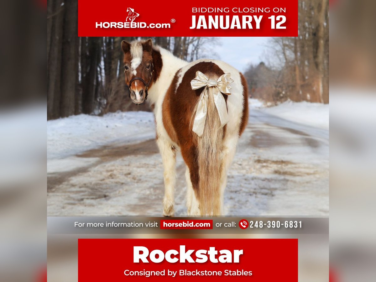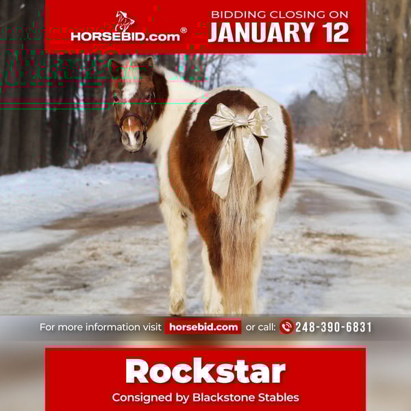 ♦️𝐍𝐄𝐖 𝐘𝐄𝐀𝐑'𝐒 𝑬𝒙𝒕𝒓𝒂𝒗𝒂𝒈𝒂𝒏𝒛𝒂♦️ Happening now thru MONDAY | JANUARY 12th - Available EXCLUSIVELY on HorseBid's website! For more details and to register visit: www.Horsebid.com CONSIGNOR CONTACT: Blackstone Stables 248-390-6831 LOCATION: Howell, MI BREED: Shetland REGISTERED: No REGISTERED NAME: Rockstar COLOR: Tri colored Paint HEIGHT: 40 in AGE: 12 GENDER: Gelding Meet Rockstar! As his name implies that's exactly what he is! This absolutely adorable 40 inch tall pony comes in a tri-color painted package! He is 12 years old with a resume several miles long! From ranch pony deluxe to English show pony he has been there and done it! Don’t let his size fool you—Rocker shows up every day with the work ethic of a big-horse and a let's do it attitude. He has all the buttons of a big horse making him perfect to learn on and grow with while keeping the little ones on a pony the perfect size for kids. He’s been around cattle, knows his job, and confidently handles real ranch work with ease. From checking cattle to helping move them he will go right to work! In the arena Rocker is a fun ride. He will walk trot and canter with ease, he knows his leads and has excellent flying lead changes! He is easy for the kiddos to steer. Rocker jumps around full courses and is a cute as a button doing so. He has been to many play day events and jr rodeos and has been on the barrel pattern and poles. He is handy, responsive, and easy to get along with. He’s also excellent with dogs, goats and sheep he doesn’t mind them running alongside. He will follow the kiddos into the living room if you would allow him in and will hang on the couch as the kids read him a story, color a picture or what ever they may come up with to do. Rocker has great manners. Kids can lead, groom and saddle him with confidence. He is gentle, while still having plenty of try and heart for a kid who wants to be involved more advanced riding. This is the kind of pony that builds confidence, teaches responsibility, and makes memories that will last a lifetime. He has seen many miles on the trails, cross country courses and back road riding. If you're looking for a pony with solid training, experience and kid miles in just about any discipline Rocker is your guy! Please contact Ellesse Schwartz 248-390-6831 for more information.