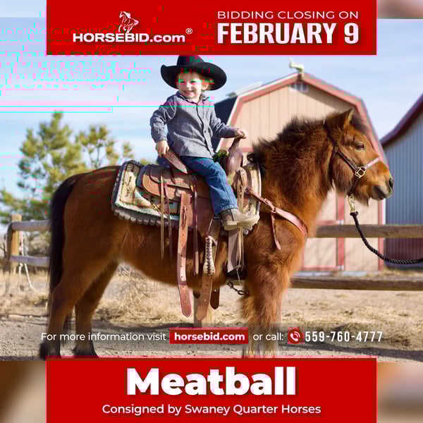 ❤️🔥𝑩𝒆 𝑴𝒊𝒏𝒆 𝐒𝐄𝐋𝐄𝐂𝐓❤️🔥 Happening now thru MONDAY | FEBRUARY 9th - Available EXCLUSIVELY on HorseBid's website! For more details and to register visit: www.Horsebid.com CONSIGNOR CONTACT: Swaney Quarter Horses 559-760-4777 LOCATION: Fort Collins, CO BREED: Shetland/ Mini Cross REGISTERED: No REGISTERED NAME: Meatball COLOR: Bay HEIGHT: 10.3 AGE: 13 GENDER: Gelding Introducing Meatball He was my nieces first horse and he has done everything under the sun. Literally everything. Jumps. Rides English and western. Carries a flag. Ropes. Drags a sled. He also drives. Goes on the trail and leadlines small babies as well. The kids have put him through the wringer over the years and he has done it happily. He is a really cool pony and is going to make a heck of a rider out of a learning kiddo. He is BROKE, and not just pull around pony broke. He can ride bridleless and he listens to the bit. He has a solid WTL. Safe on the trail and not spooky in new situations. We have hauled him to local shows and he hauls well and is the same horse off property. He’s been used in lessons and camps over the years too. He’s safe on the ground. Picks up his feet easily and loads in the trailer. He isn’t a difficult pony with a “make me” attitude. He rides good with time off. The girls do not ride him consistently and go catch him and lope him off when they desire without supervision and he has always taken care of them. He also has an awesome personality and has been dressed up more times than I can count. He is SOUND. Barefoot. Never foundered. Easy to keep and doesn’t get extremely fat even eating a big horse diet. He is a low maintenance pony and hasn’t had any health issues. He has been vaccinated and wormed on a schedule for the past 6 years in my care. This pony has been part of our family and not traded around. Had his teeth done last year. Current coggins and pre sale soundness exam/ vet check on file. We are going to miss this sweet pony and hope he can make someone just as happy as he has made our family over the years. This is a quality pony with a lot of life and teaching to give an aspiring cowboy/ cowgirl. Please don’t hesitate to reach out and ask questions and come by and meet him! You won’t regret meeting this sweet fluffy boy.