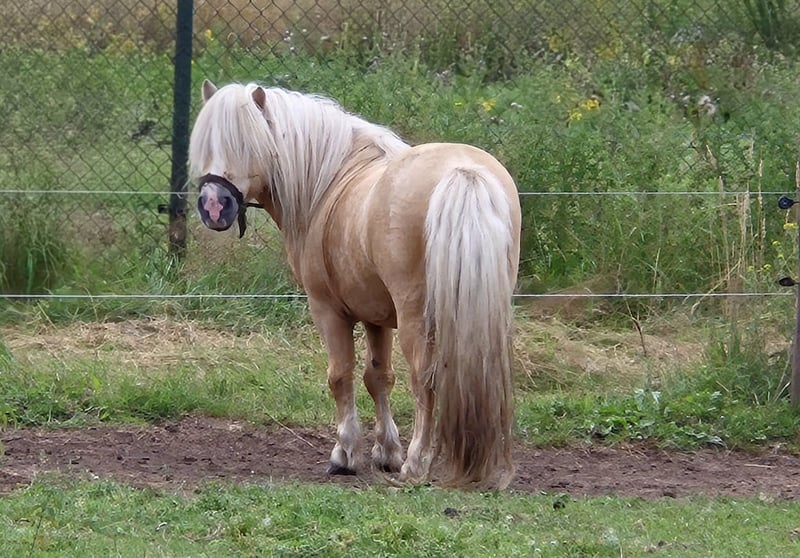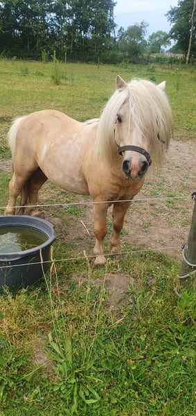 Schöner goldfarbener Shetland-Hengst mit Bles. Im Besitz eines Passes und lebenslang zugelassen beim NMPRS. Vater: Highlight vom Ellernbrook Mutter: Amber van Stal De Hestert Vaters der Mutter: Kerswell Cloud