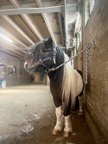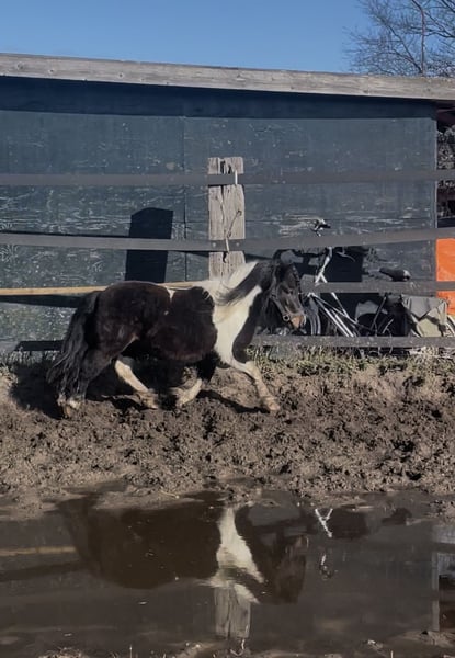 Sweet 4-year-old Shetland stallion Born on May 8, 2021 Bingo has his stallion traits (wanting to show off his teeth everywhere and getting excited when a mare passes by), but he is not a mean pony. He is very human-oriented and enjoys working. He is fearless and accepted the saddle immediately, despite never being ridden before. He has limited vision in his right eye and a poor left hind leg (contact me for videos). The lameness will likely improve with more exercise. He also needs to see the farrier. Feel free to ask any questions!