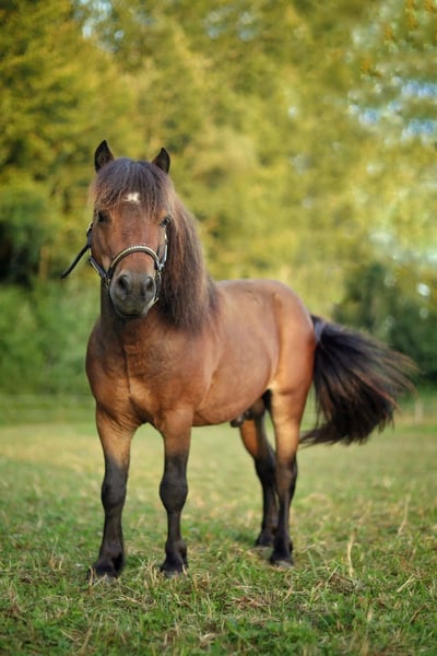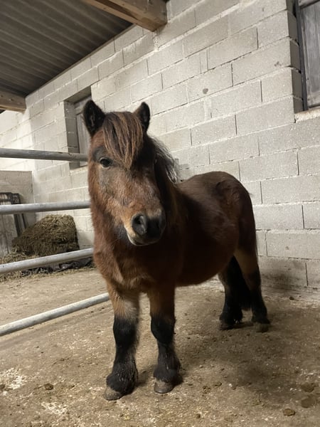 Étalon de 2020 Pp shetland livre A Bai de taille intermédiaire Produit de bons poulains, vit en troupeau très gentil et respectueux Debourré monté et attelage