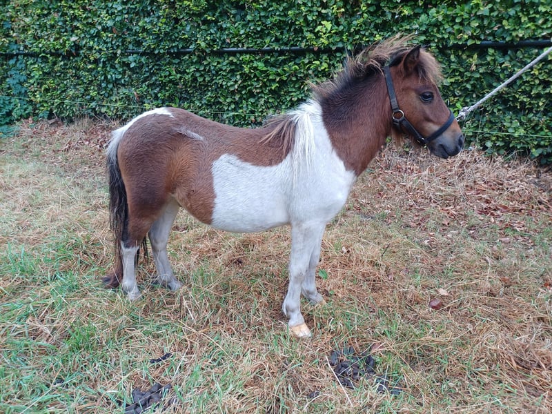 Driekleurige minishetlandhengst. Zeer beste type, hoofd en bewegingen en mooie bloedlijnen Duke stable en Bromishet. Pony is zeer mak en leergierig.