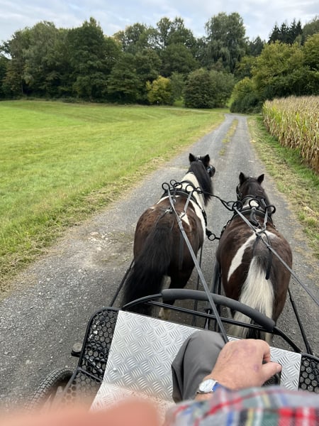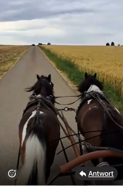 Mona und Lisa sind 10&11 Jahre alt. Sie lassen sich gut vor der Kutsche anspannen und stehen ruhig. Sie kennen den Zug und die Geräusche an der Kutsche und laufen gut. Sie stehen erst am Anfang ihrer Fahrausbildung. Sie brauchen noch Training beim Kurven fahren und insgesamt noch Routine. Sie lassen sie gut führen, ohne dauernd fressen zu wollen. Mona wurde geritten. Lisa geführt. Beide lassen sich gut longieren. Sie haben keine Rehe und kein Hautekzem. Auf Wunsch können auch passende Kutsche und Geschirr miterworben werden.