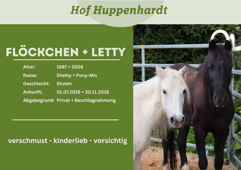 Wir suchen ein neues Zuhause für unsere 2 Ponystuten Letty und Flöckchen! Letty: Die ca. 2006 geborene Stute wurde von uns in 2016 zusammen mit ihrer Mutter durch eine Beschlagnahmung des Veterinäramtes zu uns gebracht. Letty hat einen sehr eigenen, aber sympathischen Charakter. Sie ist eher ein Frauenpferd. Männer haben es oft schwieriger eine Verbindung zu ihr aufzubauen. Bei uns darf sie viel Bodenarbeit machen, liebt Spaziergänge und wird gerne geputzt. Letty ist anderen Pferden gegenüber eher ranghoch, geht Streitereien aber aus dem Weg. Ihr Krankenblatt ist leider gut gefüllt.. sie leidet an einer chronischen Rehe, welche immer mal neue Schübe mit sich bringt. Daher hat sie vorne einen Beschlag. Durch eine alte Verletzung steht ihr Becken schief, dies beeinträchtigt sie allerdings nicht. Allerdings sollte sie dadurch nicht geritten werden. Ebenfalls ist sie Cushing-Patientin und benötigt Medikamente. Flöckchen: Die ca. 1987 geborene Stute wurde von uns in 2019 zusammen mit ihrer Tochter von privat übereignet. Flöckchen ist eine neugierige und aufgeschlossene Stute, die alles und jeden liebt! Bei uns darf sie viel Bodenarbeit machen, liebt Spaziergänge und wird gerne geputzt. Flöckchen ist anderen Pferden gegenüber eher rangniedrig. Ihr Alter sieht man der Stute nicht an! Aufgrund einer Cushing-Erkrankung ist sie mit Medikamenten eingestellt. Auch hat sie zahlreiche Schimmelmelanome, welche ihr aber keine Probleme bereiten. Wir wünschen uns für die beiden eine Rehe-geeignetes Zuhause, in dem die zwei noch ihren Lebensabend verbringen können. Eine kleine Ponyherde und Familienanschluss könnten wir uns gut vorstellen! Wir sind ein Tierheim für Großtiere. Alle unsere Schützlinge werden nach positiver Vorkontrolle und gegen eine Schutzgebühr vermittelt. Gerne können die Tiere nach vorheriger Terminabsprache bei uns auf dem Hof besucht und kennengelernt werden.