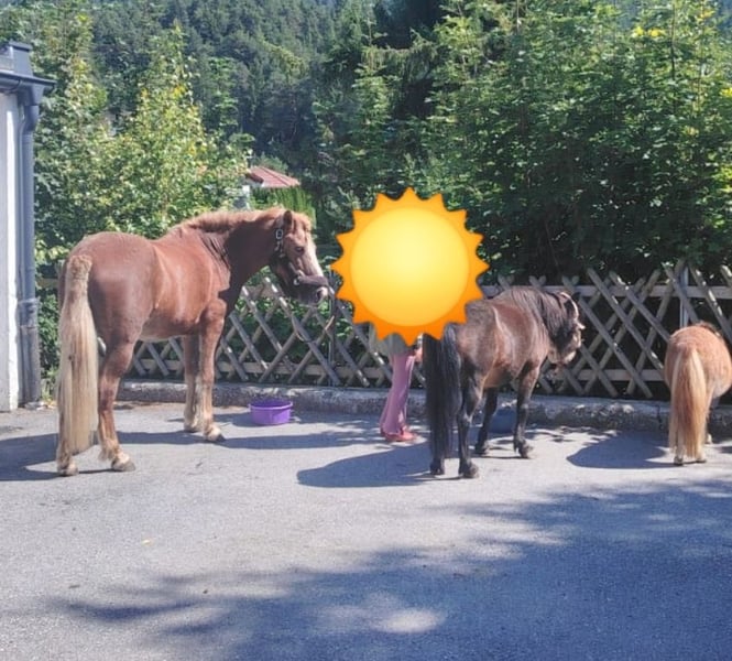 Suchen Bestplatz! Sie soll kein Wanderpokal werden! Daher würde ich sie als Beisteller bevorzugen und auch gerne zur Verfügung! Ich kann die mir gut auch mit großen Pferden vorstellen, da sie sich in der Herde anpassen kann und vorallem mit großen Pferden sehr gut harmoniert. Wir würden unsere 23J Ponystute ca 105 zur Verfügung mit Kaufoption oder Tausch anbieten. Sie soll kein Wanderpokal werden, daher biete ich sie vor Verkauf auch sehr gerne zur Verfügung an. Sie ist ein absolutes Kinderpony oder Beisteller und wird meiner Tochter leider langsam zu klein ...und seit unser Isländer verstorben ist, versteht sie sich mit unserem Mini Shetty auch überhaupt nicht mehr so gut. Dass die Rangordnung sich verändert hat ist klar, aber wir mussten sie schon einmal trennen, da wir Angst hatten, dass sie sich gegenseitig verletzen. Die Stute ist eigentlich eher Rang nieder und versteht sich auch sehr gut mit grösseren Pferden. Eventuell wäre wie bereits anfangs erwähnt auch ein Tausch eine Option gegen braves Kleinpferd, grösseres Pony (kleine Handicaps auch kein Problem, muss aber absoluter Verlass und eher ruhig sein) Unser Pony ist so typisch Stute...manchmal recht stur, eigensinnig und hat ihren eigenen Kopf. Sie ist dabei aber immer liebenswürdig und freundlich. Sie würde nie treten oder beißen. Sie neigt auch dazu an anderen Pferden etwas zu klammern und braucht ihre Herde. Daher seh ich sie eher als Beisteller, wo sie einfach ihren Lebensabend genießen kann! Wir haben sie selber erst vor ca zwei Jahren von einem Schulbetrieb gekauft. Da hätte sie von der Größe auch noch perfekt zu meiner Tochter gepasst. Sie hat Probleme beim Huf auskratzen lassen und Tierarzt mag sie überhaupt nicht. Auch der Hufschmied kommt mit ihr ins schwitzen ;)wurde aber regelmäßig mit leichter Sedierung vorgestellt. ...ich denke die hat da einfach recht schlechte Erfahrungen gemacht, aber wir haben es bereits eh schon viel besser hin bekommen. Zubehör wie Decke, Zaumzeug und verschiedene Halfter können mitgegeben werden. Krankheiten sind keine bekannt. Bis auf einen Bockhuf hinten,keine Hufrehe und auch keine Ekzeme ist die topfit! Pony typische hatte sie schon mal einen Pilzbefall und wurde mit Impfung sofort behandelt. Zaumzeug mit Trense mag sie auch nicht so gern, sie ist aber auch gut Gebisslos gut reitbar. Meine Tochter ging mit mir auch regelmäßig ausreiten, da zeigte sie sich recht unerschrocken und brav. Spazieren und ausreiten liegt ihr am besten. Beim spazieren zieht sie manchmal gern, aber mit konsequenter Disziplin geht sie brav neben einem her. Am Reitplatz ist sie nicht so gern gelaufen, da zeigte sie sich oft recht stur, aber auch da macht sie letztendlich mit und versucht uns immer zu gefallen. Bodenarbeit und longieren haben wir auch viel geübt. Falls Tauschoption: wir haben einen Offenstall und im Sommer Waldkoppel/Sommerkoppel. Pferd und Mini Pony. Wenn man mehr über sie wissen möchte einfach fragen ☺️ Bei ernsthaften Interesse Pn! Bevorzugt Beistellplatz! Standort Tirol Österreich