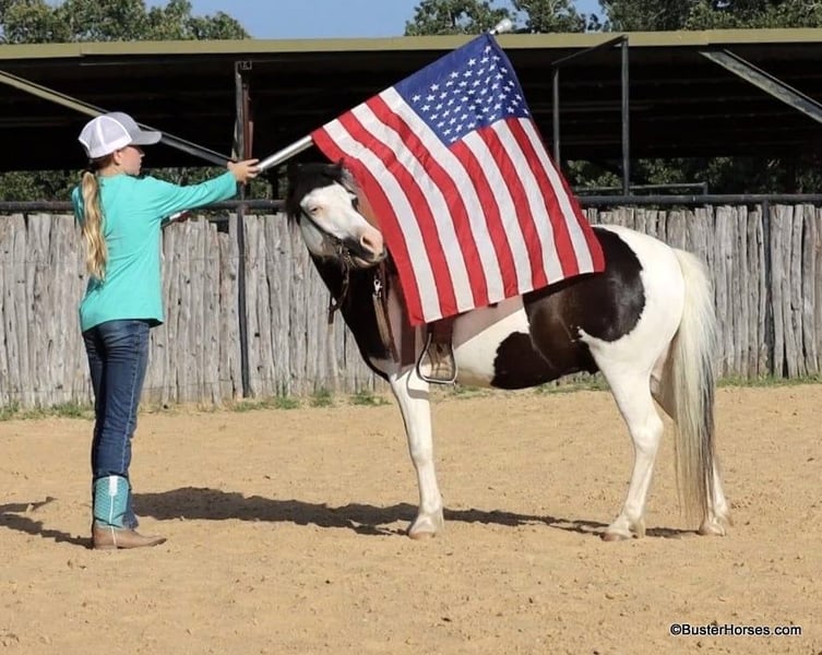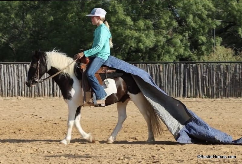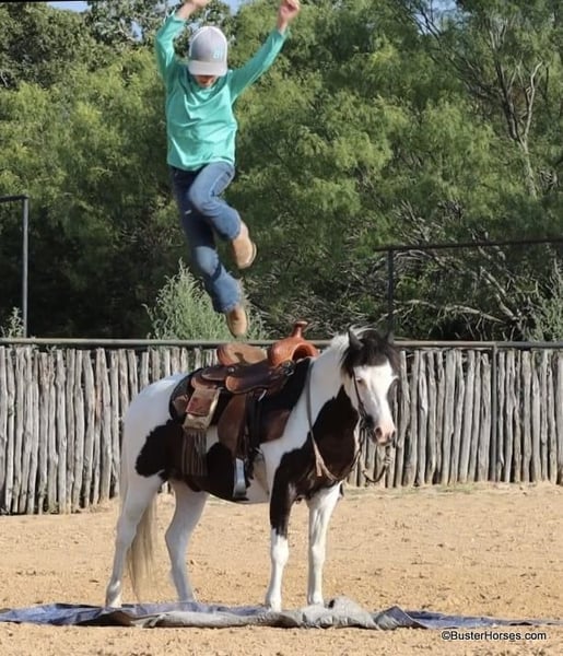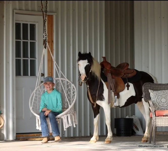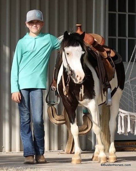 ONLINE AUCTION Place your bids at www.PlatinumEquineAuction.com Starting Bid $3500 Auction ends July 21st, 2024 Need a new saddle? Check out White Rock Saddles on our website or Facebook! Casper is a 10.3H, 5 year old black and white paint pony gelding If your child is looking for a pet dog they can have a relationship with – and also ride – then Casper is your pony. This little guy is about as fun, curious, and overly friendly as they come! – hence the name – He loves being with someone and loves having something to do and someone to be with. If you are wanting your kiddo to have that special friend that whineys and comes running when they get off the bus – this is one of those rare ponies that REALLY genuinely loves kiddos, being with you, and doing things with you. He will make many irreplaceable childhood memories. And he is just the perfect size for kids to be able to do it all on their own for many years, without outgrowing him too quickly. My kiddo in the video is 11, and tall for her age, this little guy is stout made and will last the kids for several years. If your kiddo watches the Heartland TV series, and dreams of the liberty work play, than he would be a great little teacher to learn the ropes on. This pony naturally joins up and follows you, and loves doing it. Separate from his super fun personality and being just adorable to have around, Casper also really rides around! He trot and lopes willingly, has a decent little work ethic, not at all the typical punk pony pushy attitude. He naturally carries himself balances and cadenced, is a cute mover, takes both of his leads simply and evenly, and he has a great stop. He travels around on a nice relaxed rein with his ears up. Casper does have a reasonable reserve, and he will go on my daughter’s “Rolex string” (you have to call and ask for an explanation on this definition). Casper is up-to-date- on all cares, was just trimmed this week, his teeth were also done by an equine dentist (right after this video was shot, we’ll try to get additional videos before sale time), he had his sheath cleaned, his ears treated for ticks, and he was also power packed wormed. He is good to shoe as well, but has great feet and goes really well barefoot – if his new owner prefers him to be shod, we can have him shod prior to him heading to his new home. He will arrive at his new home up-to-date and ready to go to work! We are experienced, knowledgeable sellers, and we can help with quickly arranging affordable shipping to any buyer’s location – we have experience shipping worldwide – including regularly to Hawaii, Canada, Mexico, Europe, and South Africa. Please go to our website for additional pics and videos BusterHorses.com Call Buster Horses Ashley 214-605-7174 Located in Weatherford, TX. ONLINE AUCTION Place your bids at www.PlatinumEquineAuction.com Starting Bid $3500 Auction ends July 21st, 2024 Need a new saddle? Check out White Rock Saddles on our website or Facebook!