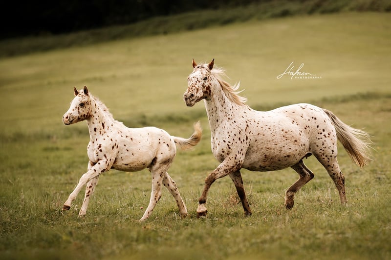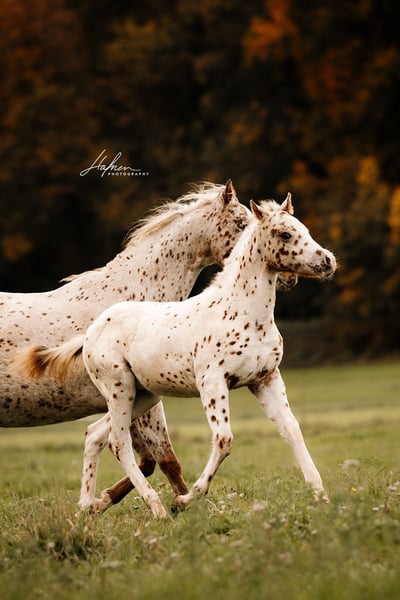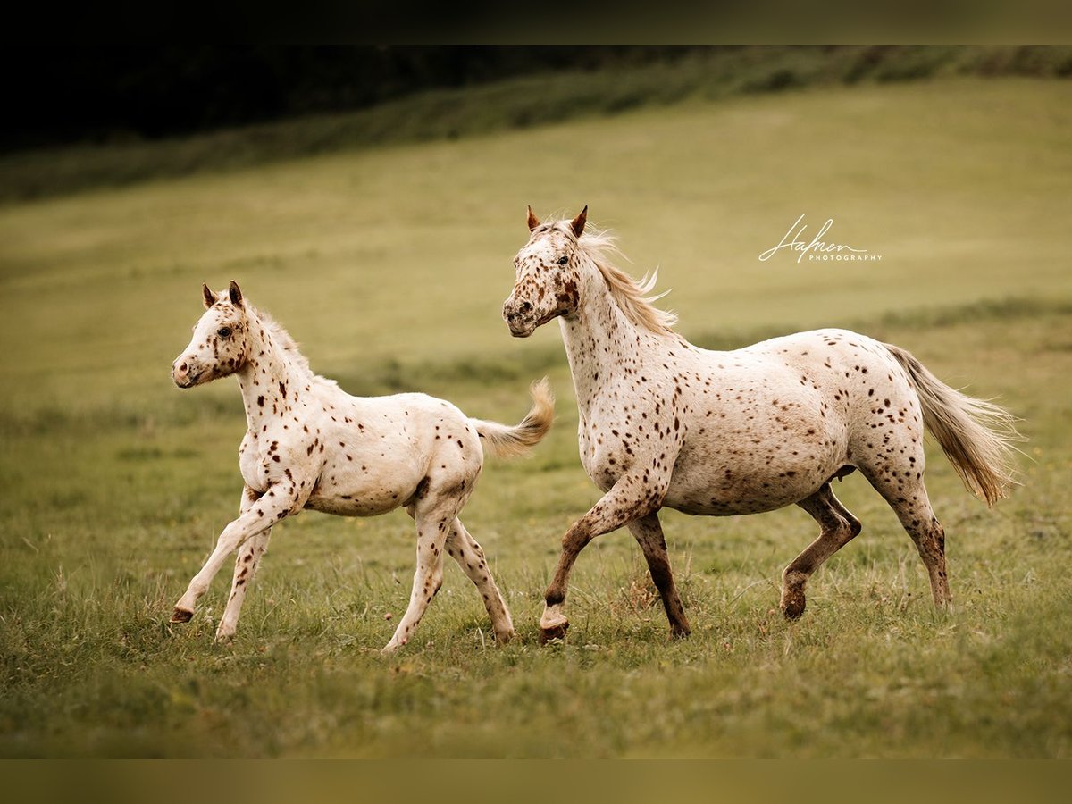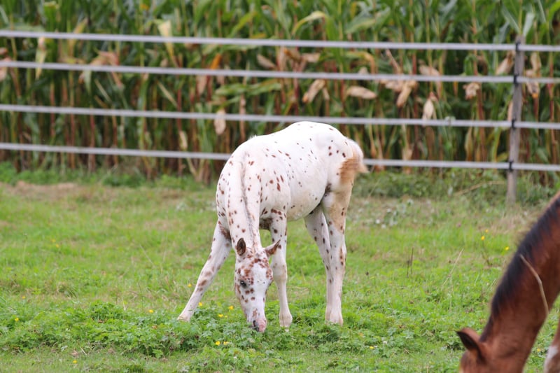 For sale is a beautiful colt of the breed Pony of the Americas. Our Freckles is a real eye-catcher with his striking leopard coat and a lovely face! With an expected final height of 138 cm, he will be perfect for children and teenagers, as well as light adults. He is also expected to have a strong and stable foundation. This charming little stallion is already captivating everyone, is always friendly, and loves children. At the time of sale, Freckles will be halter trained, dewormed multiple times, and familiar with the foal ABC. He will also come with a pedigree certificate from the USA and an equine passport with breeding certificate from Germany.