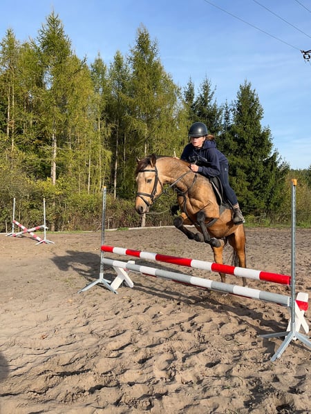 Beautiful buckskin stallion. The stallion is licensed and entered in the Main Stud Book of the Czech Sport Pony (sire: Golden Ray – German Sport Pony). At the breeding selection he received the highest scores for jumping technique and temperament. He is handled and groomed by children and ridden by girls aged 12–15. The stallion jumps his own height. For sale due to a change of bloodlines in our breeding program and because we do not have the opportunity to fully utilize his jumping potential. Easy and problem-free to handle and care for; he is regularly managed by children. 🐎