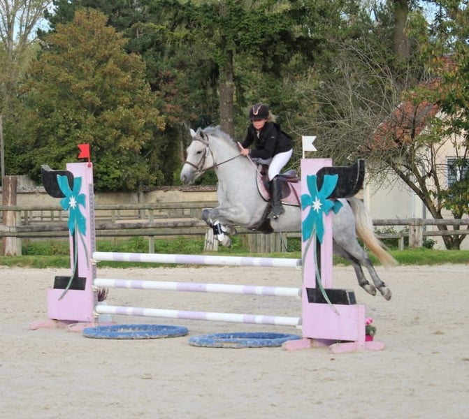 French Riding Pony (FRP) Born on April 15, 2018 Filly, approximately 145 cm (D pony) A high-quality mare that combines reassuring “life assurance” qualities — patient, gentle, and calm — with the performance needed for show jumping competitions. She is frequently placed in competitions, offering confidence and performance to both intermediate and experienced riders. Whether for jumping, leisure, or hacking, she remains impressively calm. Very gentle on the ground as well, she will happily negotiate carrots with a smile. Family pony Sport pony Leisure pony Competing in P4-C4 / C3-C3 / P2-C2 / P1-C1 classes and has been training in the Elite P since September, with two competitions under her belt, including a first-place finish. Regional Champion of Seine-et-Marne in 2024 in P2 3rd at the departmental championships in Seine-et-Marne in 2024 in P1 8th at the French Championships in 2025 in P2 Some figures: In 2024: 9 clear rounds out of 15 competitions at all heights with her owner 13 out of 15 rounds in the top three in 2024 with her owner In 2025: 8 clear rounds out of 10 competitions at all heights with her owner 9 podium finishes out of 10 in 2025 with her owner Don’t hesitate — this is a top pony for development and enjoyment! Perfect Christmas gift A family pony, ideal for progressing safely and learning Suitable for both experienced riders and beginners Suitable for children and adults who are not too heavy