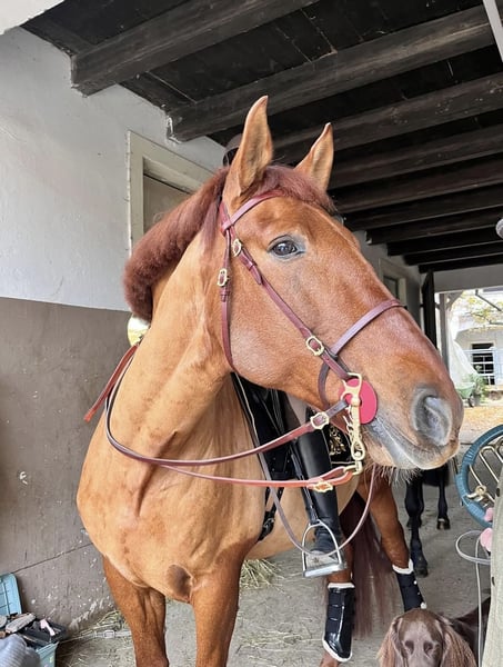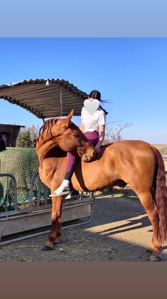 For sale: this stunning PRE Andalusian chestnut stallion. With his vibrant red coat and charming personality, he always stands out from the other horses. Due to my health issues, I have to part with my Fuego, which I do with a heavy heart. He is a true treasure in daily handling and has nerves of steel. Whether farrier work, grooming, grazing, walks, trailer loading, deworming, vaccinations, washing, … he is completely easy to manage! He always seeks closeness to people, and with his playful, curious nature, it’s always a pleasure to be with him and work with him. His curiosity leads him to inspect and explore everything. You can’t resist giving him a little horsey kiss! Under saddle, he already shows some temperament (typical of a Spanish horse), but with experienced riders, he is well-behaved. The work is all the more enjoyable because of this. Nevertheless, he is not a beginner’s horse. Fuego is sensitive to riding; you mostly just need to remember to ask, and he will respond accordingly. He was born in Spain in 2015 and was lovingly and professionally started under saddle here in Austria. His current training level is L/M: • Extended trot • All lateral movements • Transitions • Backward riding (trot/canter from halt) • First piaffe steps • Preparations for flying changes started • Pirouette work begun Riding in the terrain is especially fun with him. He is used to going alone but also works perfectly in groups, as he is generally a very tolerant horse. He is also accustomed to a dog running alongside while riding. If there’s a creek or a swimming spot nearby, he knows that too and loves it. He is very well-behaved in traffic: • No fear of cars, motorcycles, buses, etc. • Bicycles, strollers – no problem • Loud children – remains calm Generally, everything new is inspected and examined until it’s understood. When treats are involved, he is always eager to cooperate. I have also started liberty work with him; he learns very quickly and shows great interest! If you are interested, please call 0664/4167572. If I don’t answer, please leave a short message on the voicemail, and I will call back! I wish him a wonderful new home. He is familiar with both box and pasture turnout. Currently, he is in a paddock box.