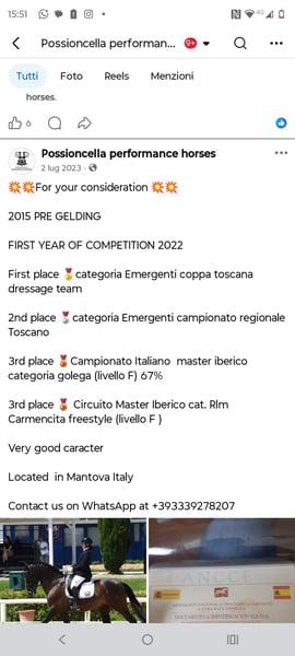 Vendo splendido cavallo di razza PRE con documenti , castrone, nato nel 2015. Di colore morello, si distingue per la sua eleganza e il suo carattere equilibrato. Ideale per discipline di dressage, è perfetto per chi cerca un compagno affidabile e di qualità per le competizioni o per l'agonismo. Ottimo stato di salute e allenato con cura. Per ulteriori informazioni e per organizzare una visita, non esitate a contattarmi.