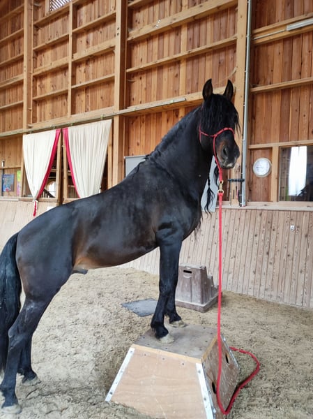 Galant ist ein sehr sensibler Kerl und wohnt mit einem zweiten Wallach im Offenstall. Geht barhuf und ist brav beim Schmied Lässt sich gut verladen und ist das Wegfahrwn gewöhnt Hab mit ihm folgendes unternommen Dressur Nadel Working Equitation Kurse Extrem Trail Kurs Rinderkurs Wanderreiten Ist sehr fein zum Reiten,macht schön Freiarbeit und kennt paar Zirkuslektionen