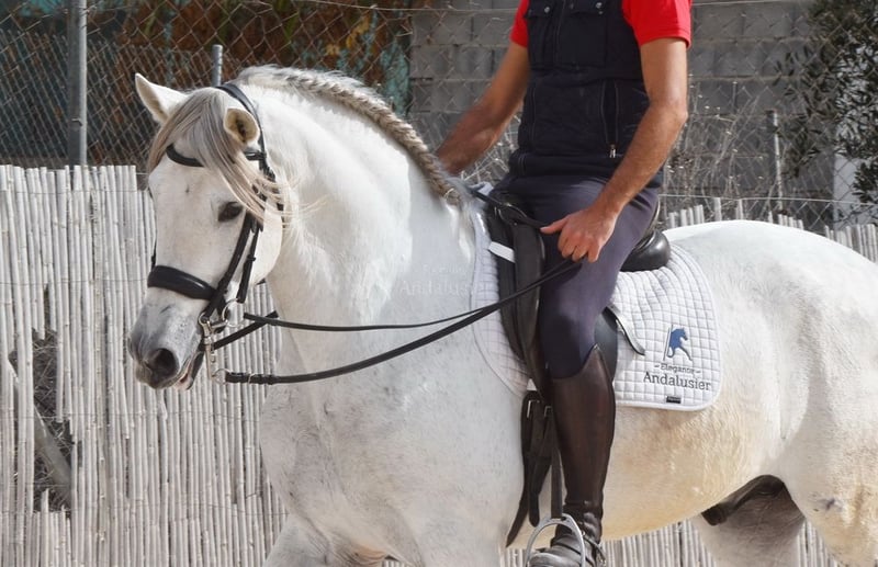caractère aimable avec un tempérament agréable, trot moyen, allures latérales, reculer, galop extérieur, pirouettes au galop, changements de pied au galop à la volée, pas espagnol, piaffer, passage, terrain, grand, baroque, bonne ascendance, a déjà des radios et est Piro négatif, ascendance : Yeguada Militar, Yeguada Quintanilla, Lovera, San Roman, Opa Lobito IV et Uropa Fatuo de Nadales sont qualifiés www.elegante-andalusier.com