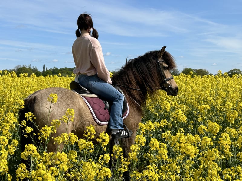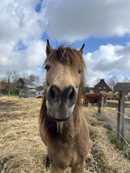 We are heartbroken to be looking for a new owner for our beloved Buckskin gelding, Espirito. Unfortunately, my daughter no longer has the time to care for him due to her training commitments. He was born in 2011 and stands at approximately 1.46 meters. He has been with us since 2020. Espirito, or rather Spirit, is a wonderfully sweet pony who is completely fearless and relaxed in the terrain. However, he also has a small pony stubbornness and is not suitable for beginners or as a weight carrier. You should not weigh more than 60 kg. His rider is a 13-year-old girl who gets along well with him. He is kept in an open stable in a mixed herd with buffalo. Spirit is somewhat lower in the hierarchy but still tries to assert himself from time to time. He is sold with all his tack and equipment and this is not an urgent sale. We are taking our time and will also visit potential new homes if possible. No dealers and no riding school operations. Due to the many riding tourists, a trial ride costs €50, which will be deducted from the purchase price if you decide to buy him.