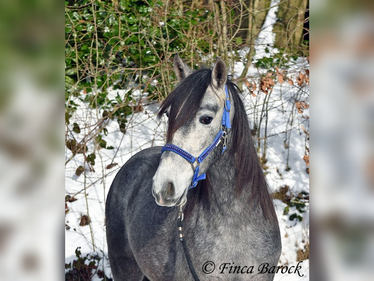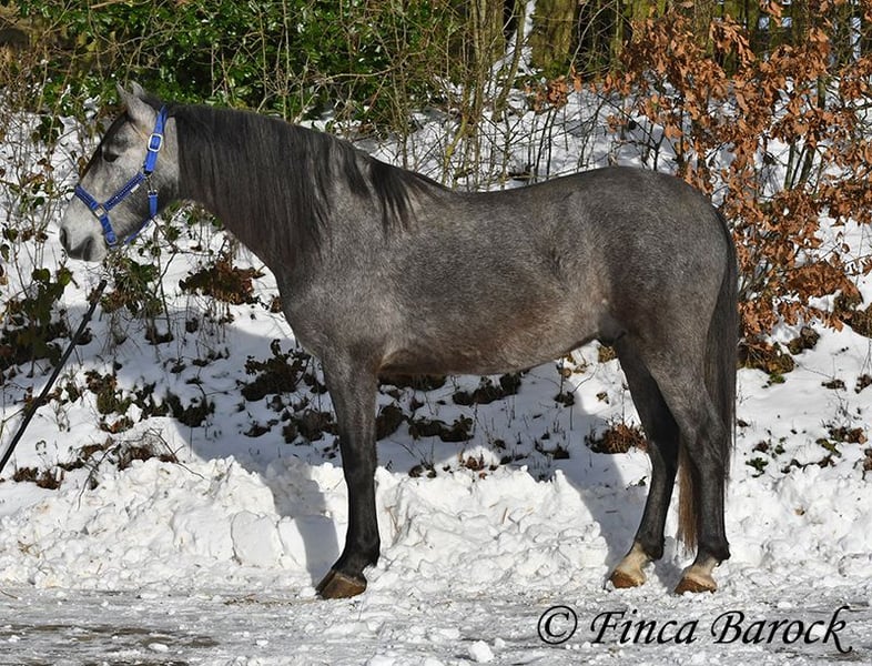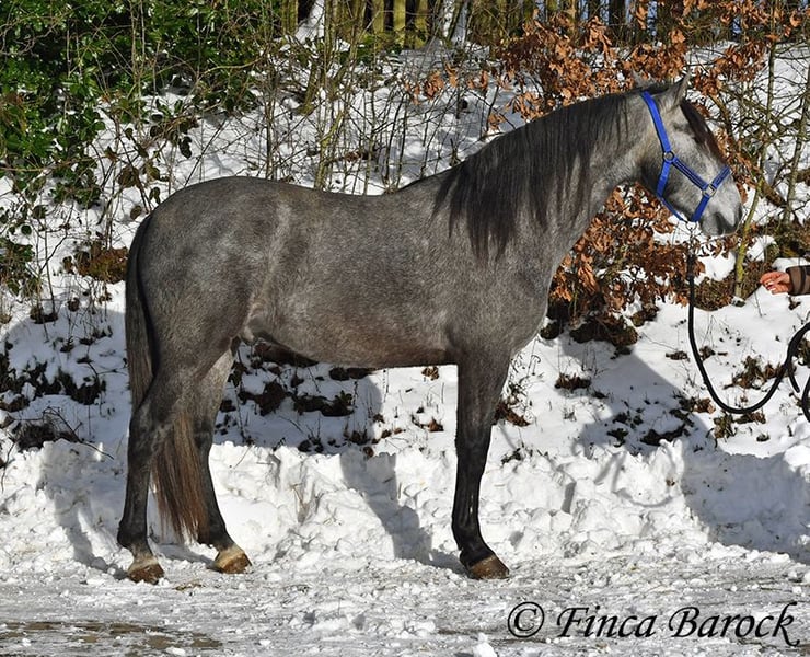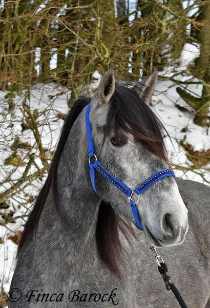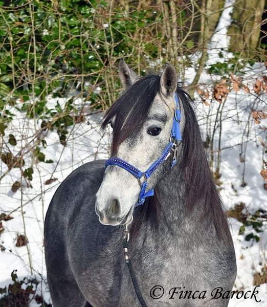 Ras: PRE Naam: Artico XIV Geslacht: Ruin Stockmaat: 1,56 m Geboortedatum: 05-04-2022 Kleur: Grijs (schimmel) Prijs: € 6.300 Vader: Calesero XLIX v. Bosqueado Moeder: Fogosa XLIV v. Bonito VI Artico, onze jongste knul met prachtige grote zwarte ogen en een dubbele manen. Hij staat nog volop in de groei en zal nog verder uitgroeien. Hij is nog heel aan het begin van zijn opleiding en toont zich aanvankelijk wat verlegen. Hoe meer hij zijn mens leert kennen, hoe opener hij wordt. Dan vindt hij knuffelen ook heerlijk en is hij erg speels. Artico kent al het longeren met de halster en zadel en bit, en wordt langzaam vertrouwd gemaakt met opstaphulpmiddelen. Over het algemeen is hij zeer leergierig en doet goed mee. Door zijn ietwat verlegen aard heeft hij tijd nodig om te wennen. We zoeken daarom iemand voor hem die hem de tijd geeft om te acclimatiseren en hem voorzichtig aan het rijden te laten wennen. Hij mag ook graag bij ons blijven voor verdere opleiding. Artico is gewend aan groepshuisvesting en toont zich hier speels en open. Inmiddels is hij volledig onbezwaard. Een prachtige PRE aan het begin van zijn opleiding, met goede basisgang en een sterk gebouwd lichaam, dat klaar is voor nieuwe uitdagingen! Vrijloopvideo: https://youtu.be/hRm4Z5HkuB8?si=iKE-NTcvQHAMn7Uw Contact: Finca Barock, Tel. 0173-696 31 81, 56291 Wiebelsheim