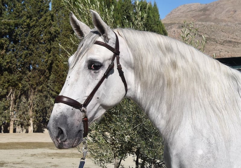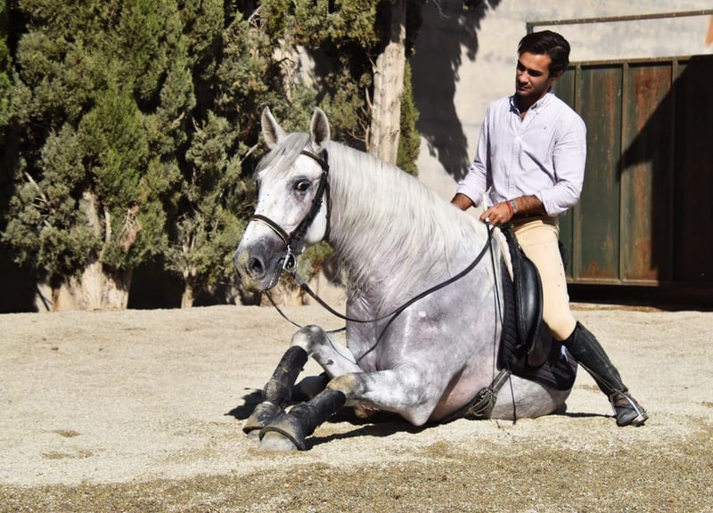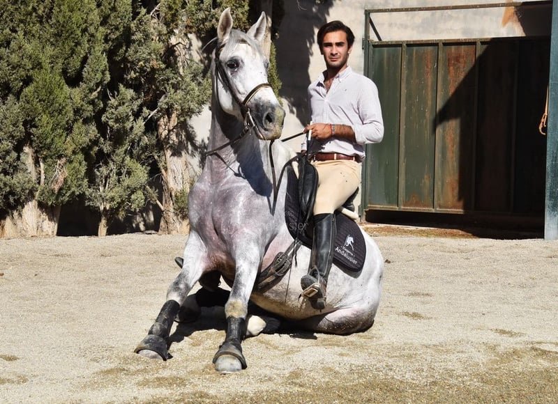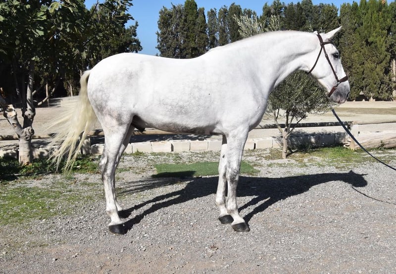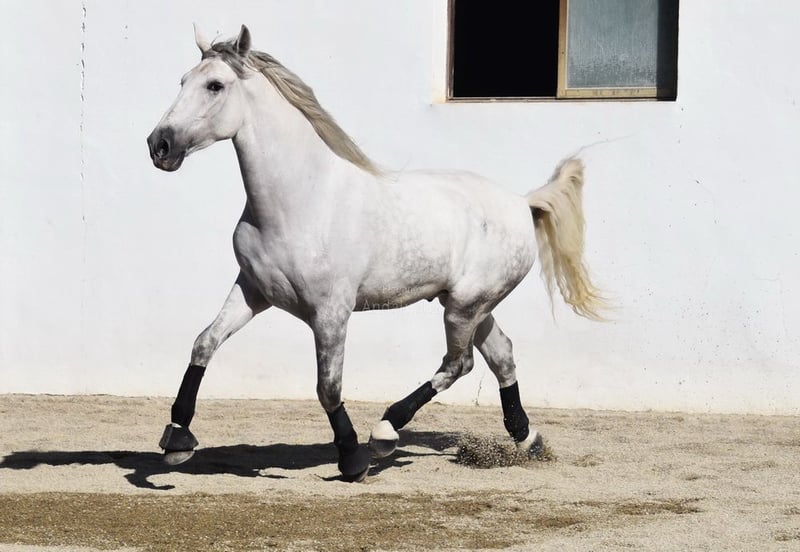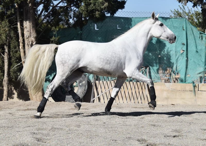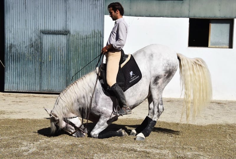 Sweet temperament, curious, affectionate, side passes, rein back, flying changes, bows, kneels, lies down, Spanish walk, Piaffe and Passage started, tall, good movement and pedigree. Pedigree: Yeguada Marques de Quintanar, Granda Losada, with several qualified ancestors. www.elegante-andalusier.com
